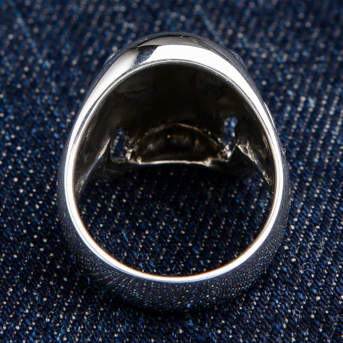 디테일에서 태도가 느껴집니다. 이 스털링 실버 해골 반지는 광택 있는 해부학적 디테일과 양옆의 강렬한 장식이 특징입니다. 관자놀이에는 아이언 크로스가 깊게 각인되어 있는데, 이는 바이커 문화에서 자유와 비순응의 상징으로 오랜 시간 사랑받아온 문양입니다. 하이폴리시 마감은 어두운 산화 디테일과 해골의 위협적인 미소와 강렬한 대비를 이룹니다. 스스로의 룰을 따르는 이들을 위한 견고하고 묵직한 고딕 주얼리입니다.
