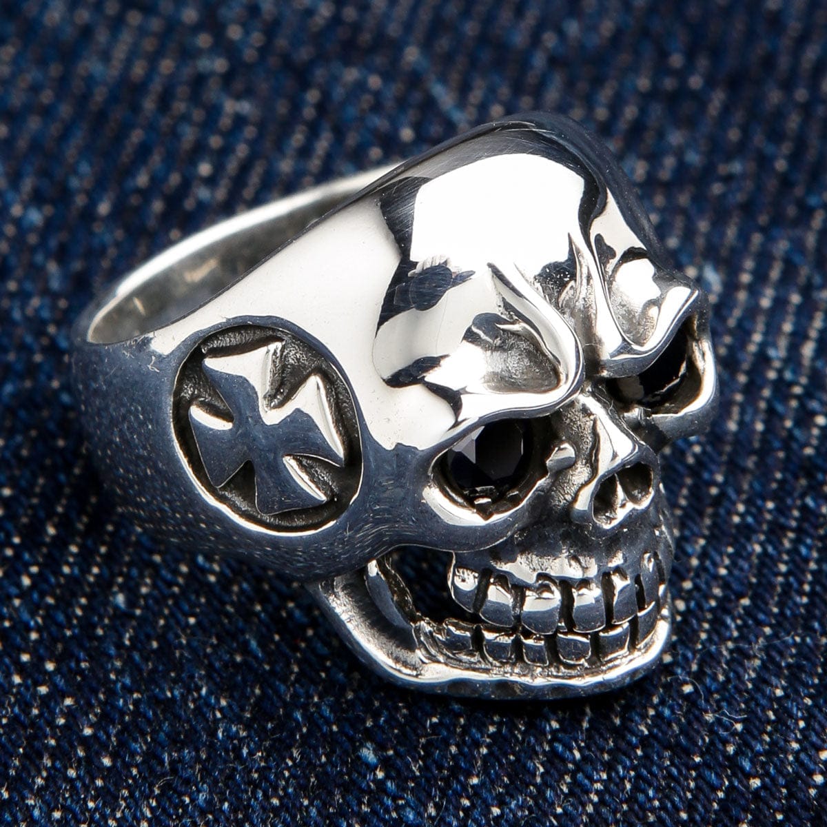 아이언 크로스 해골 반지 – 블루 아이가 돋보이는 스털링 실버 바이커 반지