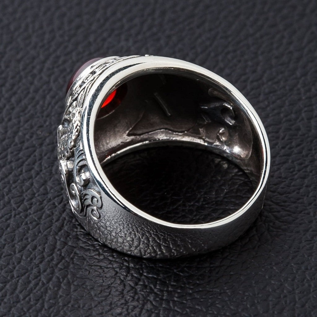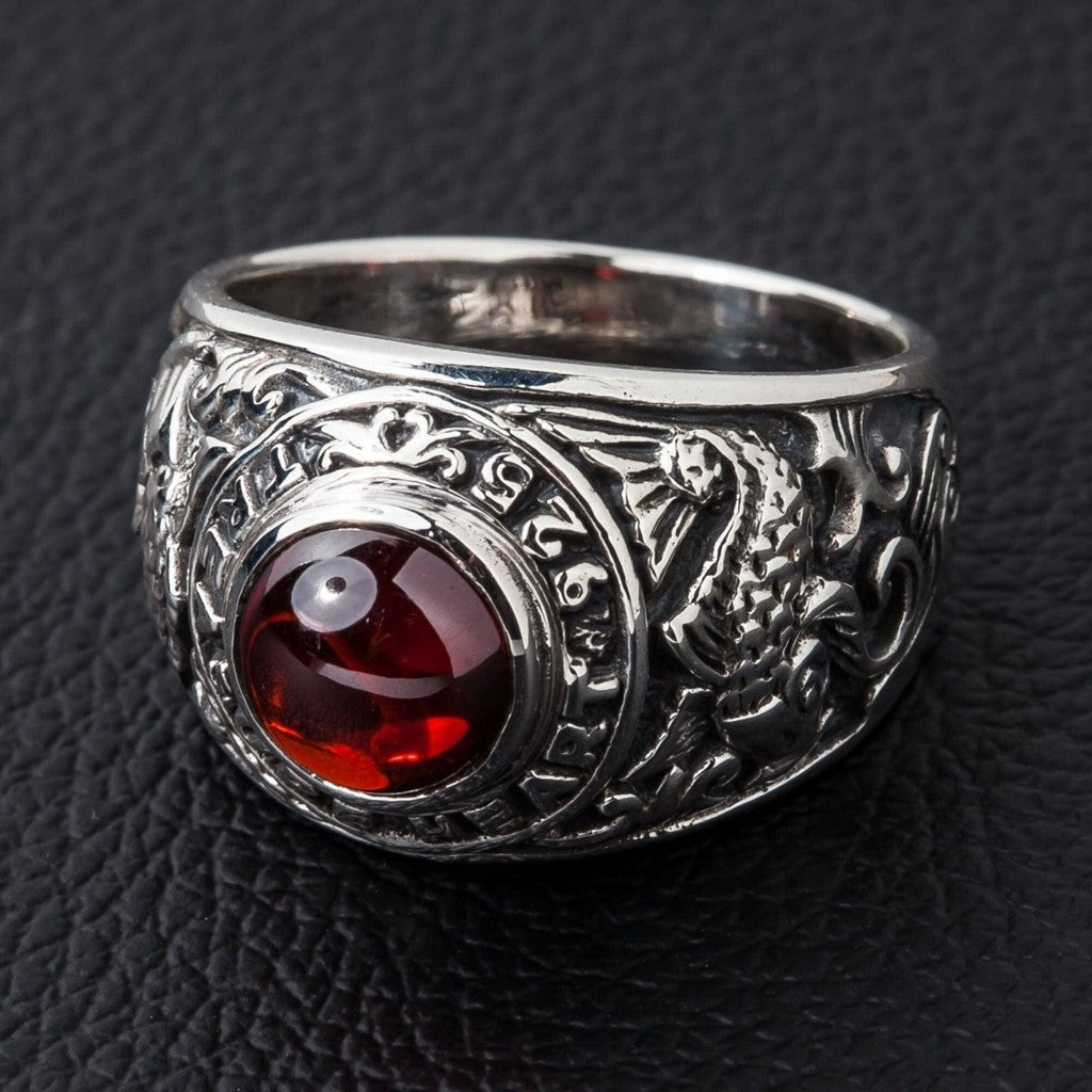 스털링 실버 일본식 코이 물고기 반지 – 레드 스톤 세팅