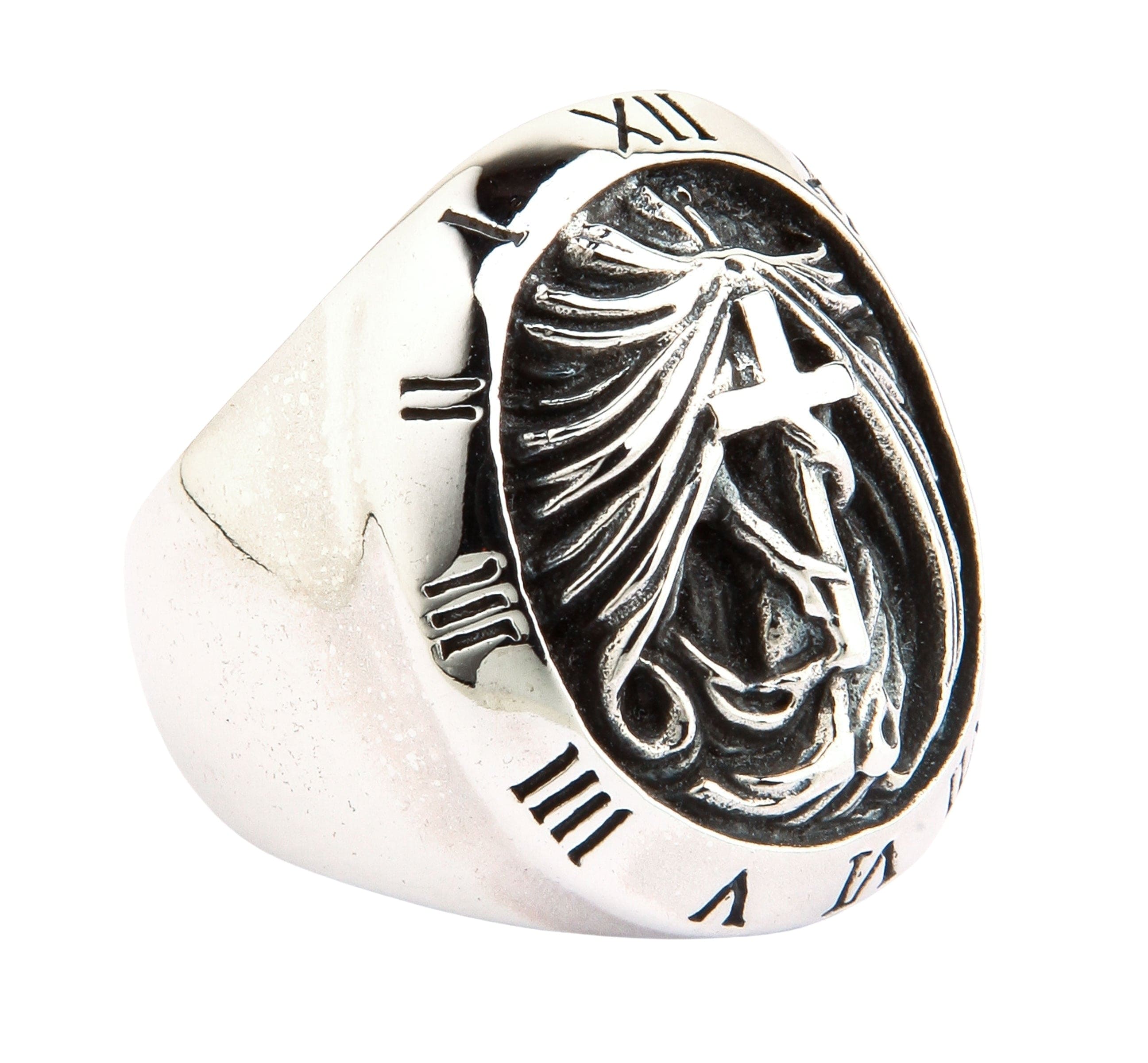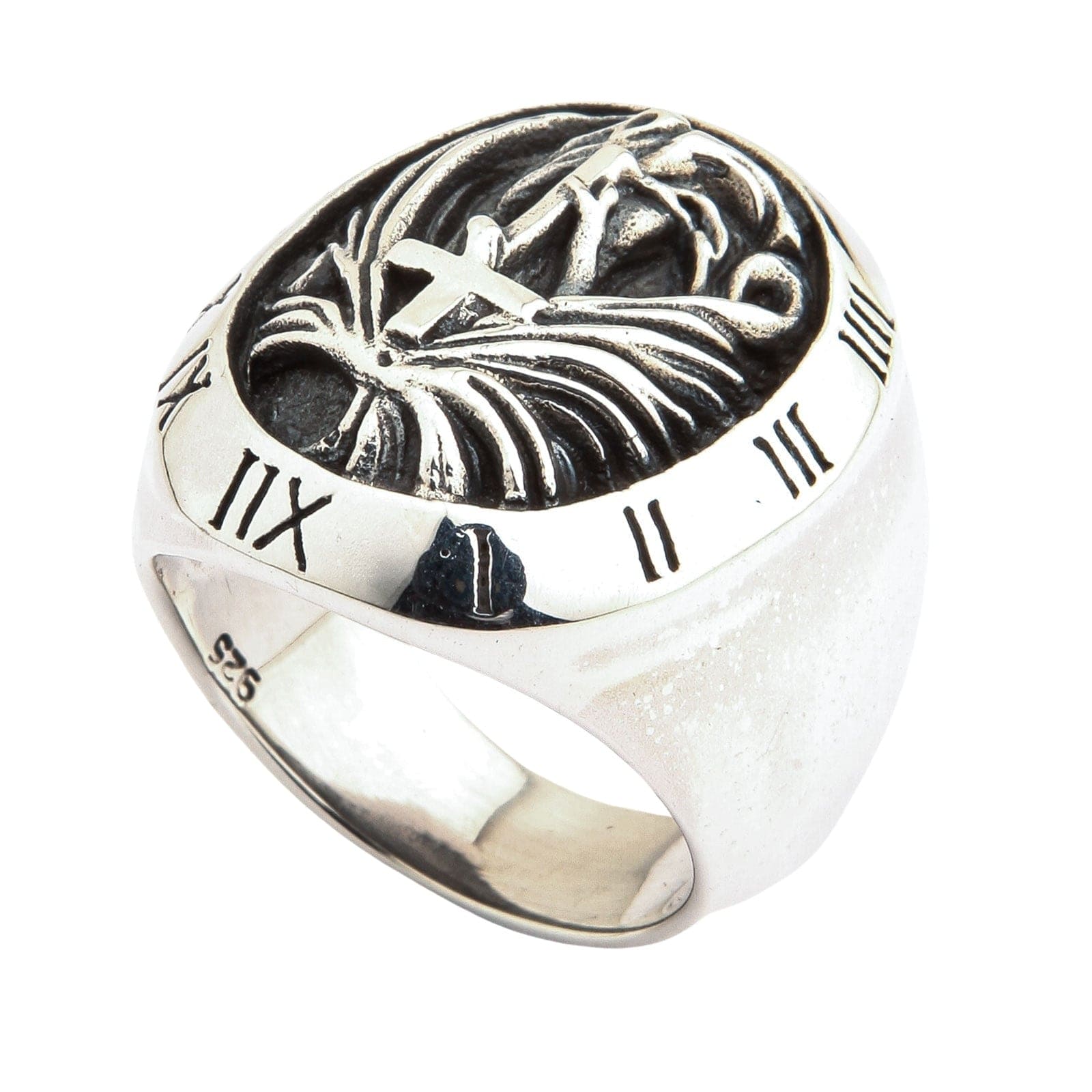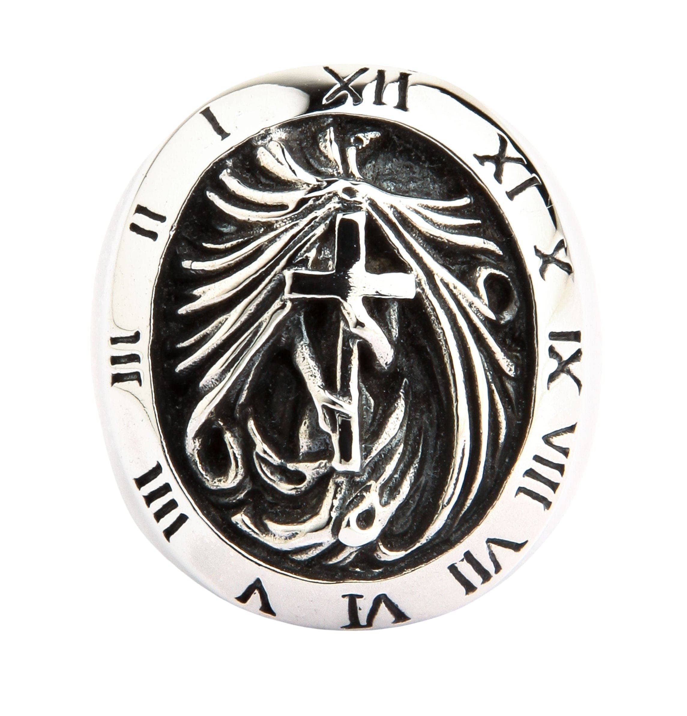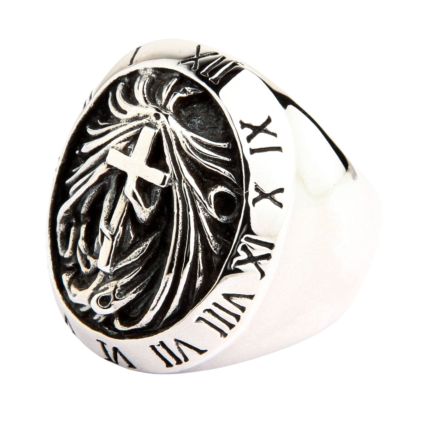 1. 이 로마 숫자와 십자가 반지는 무엇을 상징하나요? 이 반지는 강력한 메멘토 모리입니다. 로마 숫자 시계판은 시간의 흐름과 유한함을, 중앙의 이미지는 '믿음의 투쟁'을 상징합니다: 혼돈과 죄악의 배경 속에서 손과 날개가 십자가(믿음)를 붙잡고 지키는 모습을 그려, 인생 전체에 걸쳐 신념을 지키기 위한 끊임없고 영원한 싸움을 상징합니다.