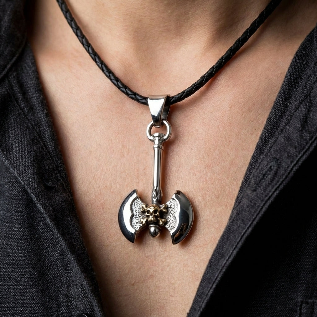 이 펜던트 디자인은 역사와 반문화에서 유래한 두 가지 강력한 상징을 절묘하게 결합했습니다. 더블 블레이드 전투 도끼는 가장 강력한 바이킹 전사들이 선택한 무기로, 힘과 정확성, 그리고 발할라로 향하는 길에서 자신의 운명을 개척하려는 끈질긴 의지를 상징합니다.