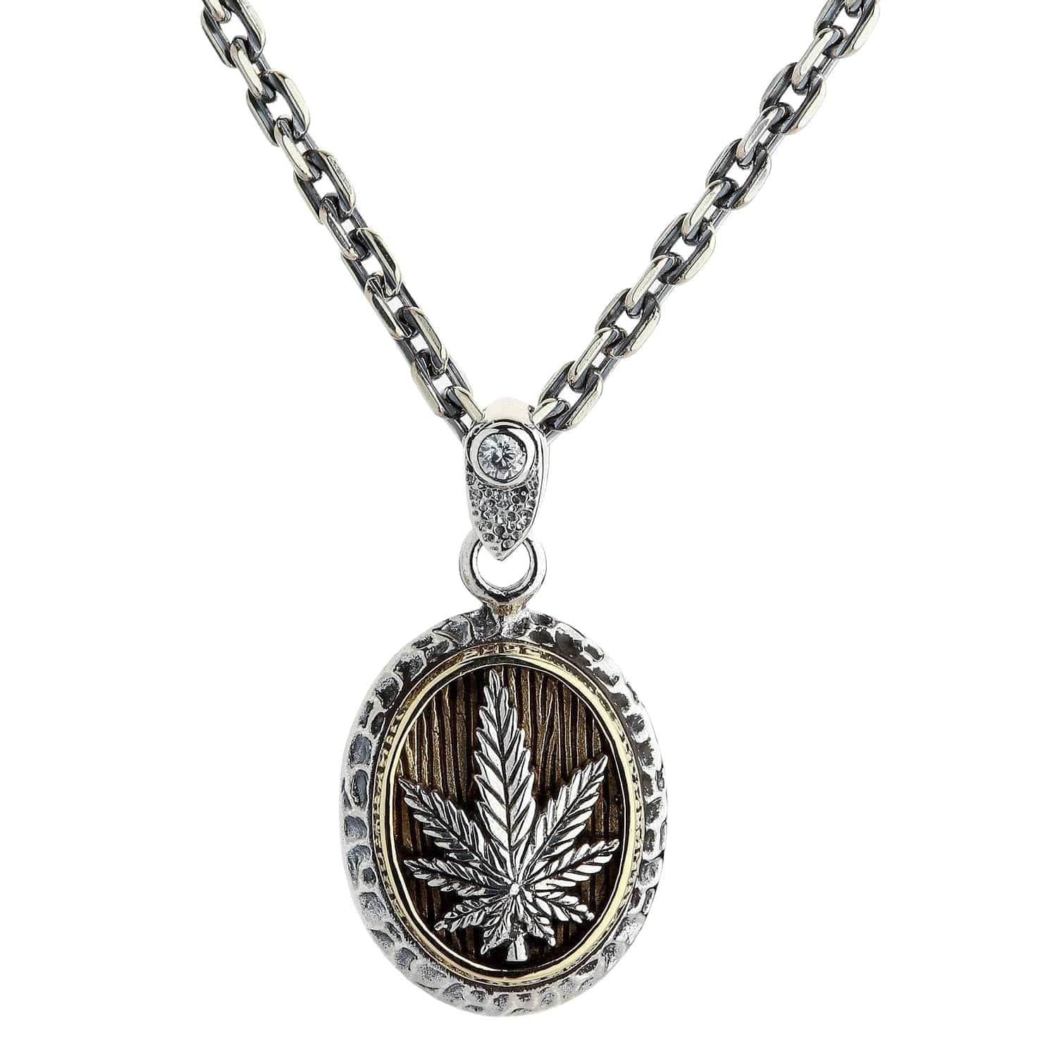 Aan de ene kant van de hanger staat een zorgvuldig gedetailleerd wietblad, een iconisch symbool van vrijheid, vrede en natuurlijke geneeskunde. Het zilveren blad is geplaatst tegen een getextureerde messing achtergrond, omlijst door een messing ring met de gravure 'Vibrations', als eerbetoon aan de positieve energie die wordt geassocieerd met ganja en reggaemuziek.