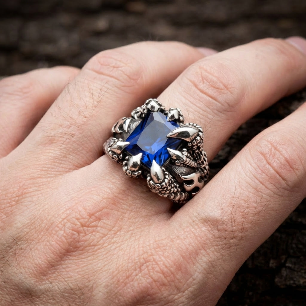 Grijp een symbool van duistere kracht met deze kolossale Claw Gothic Ring. Dit is niet zomaar een sieraad; het is een krachtig statement, een stukje hoog-gotische fantasie voor de man die zijn eigen lot smeedt. Met een prachtige blauwe saffier, vastgegrepen door de felle klauwen van een monsterlijk beest, is deze ring een embleem van ontembare kracht.