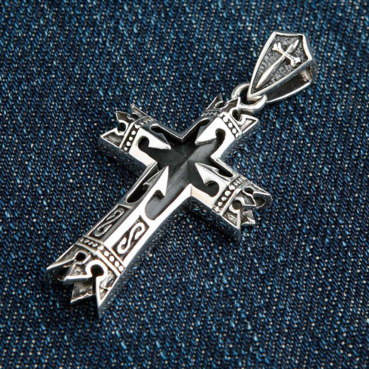 Het ontwerp van deze hanger is een meesterwerk in oude symboliek. In het hart ligt een grote, gladde zwarte onyx cabochon, een steen die al eeuwenlang wordt vereerd als symbool van bescherming, aarding en innerlijke kracht. Het kruis zelf is een kunstwerk, waarvan de armen verfijnd zijn gegraveerd met tijdloze gotische motieven, die eeuwigheid en een onbreekbaar spiritueel pad vertegenwoordigen. Deze samensmelting van het heilige kruis en het middeleeuwse ontwerp creëert een krachtig zegel voor de ware spirituele krijger. Gemaakt van maar liefst 20 gram massief zilver met een hoog-contrast afwerking, heeft deze hanger het gewicht en de uitstraling van een echt middeleeuws artefact.