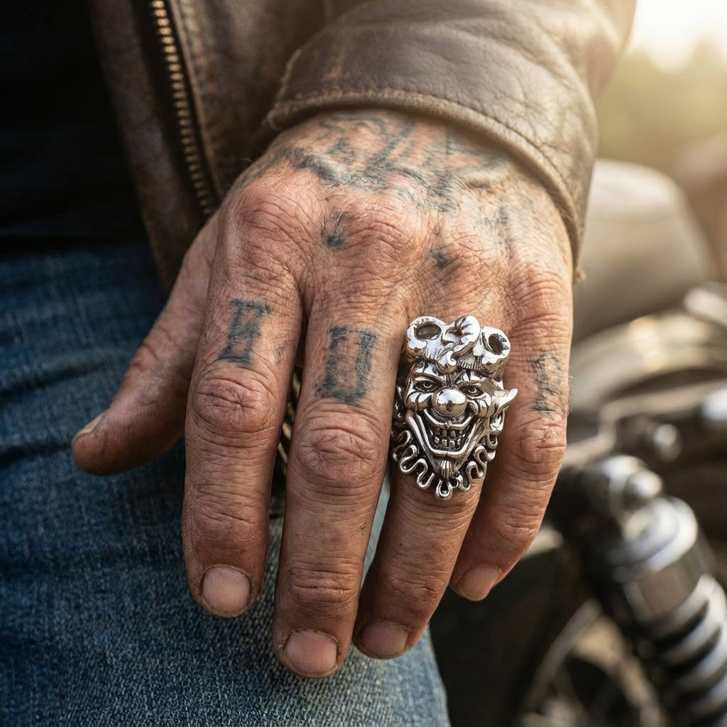 🃏 Iconisch Joker Ontwerp: Een grote en dreigend gedetailleerde ring met het gezicht van de Joker, het ultieme symbool van chaos en anarchie.