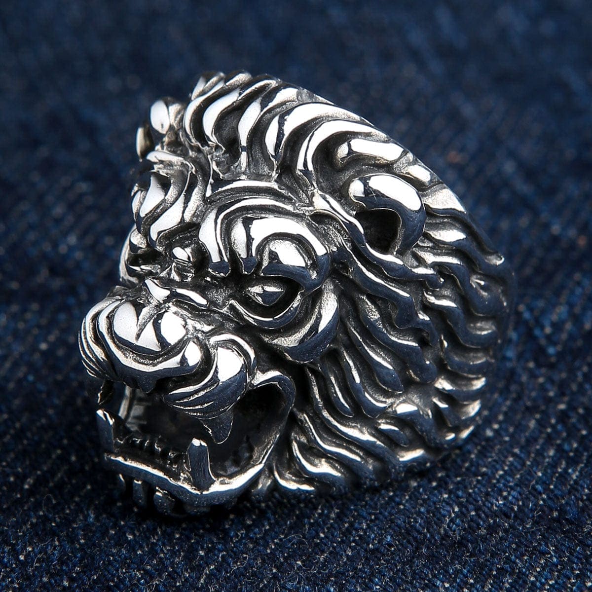 De leeuwenkop biker ring is geïnspireerd op de leeuw als universeel symbool van dominantie en bescherming. De gebeeldhouwde manen vloeien met verfijnd detail en omlijsten een felle, opengesperde uitdrukking die de essentie van rauwe kracht vangt. Deze zware leeuwenkop ring is meer dan een sieraad—het is een persoonlijk embleem voor wie overal respect afdwingt.