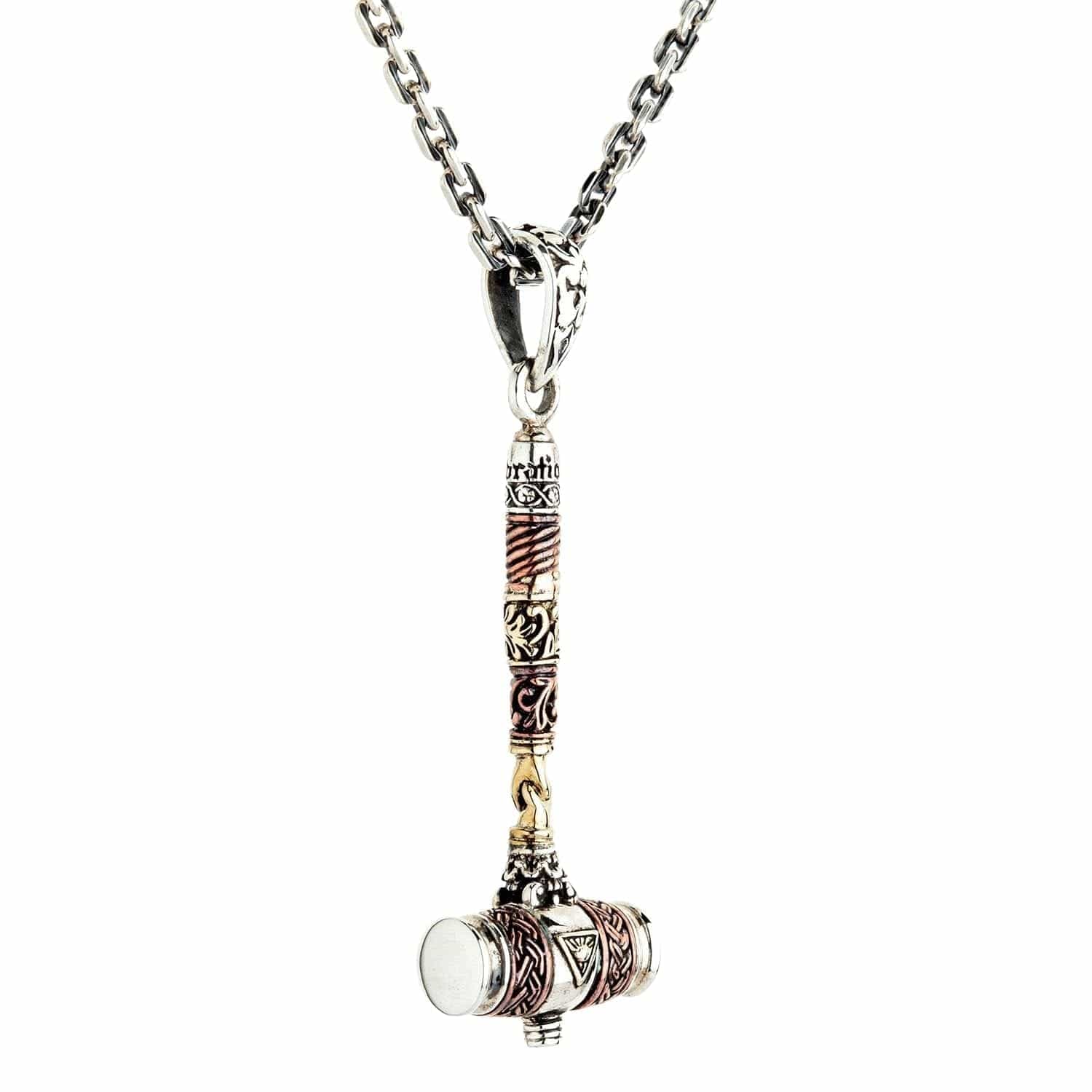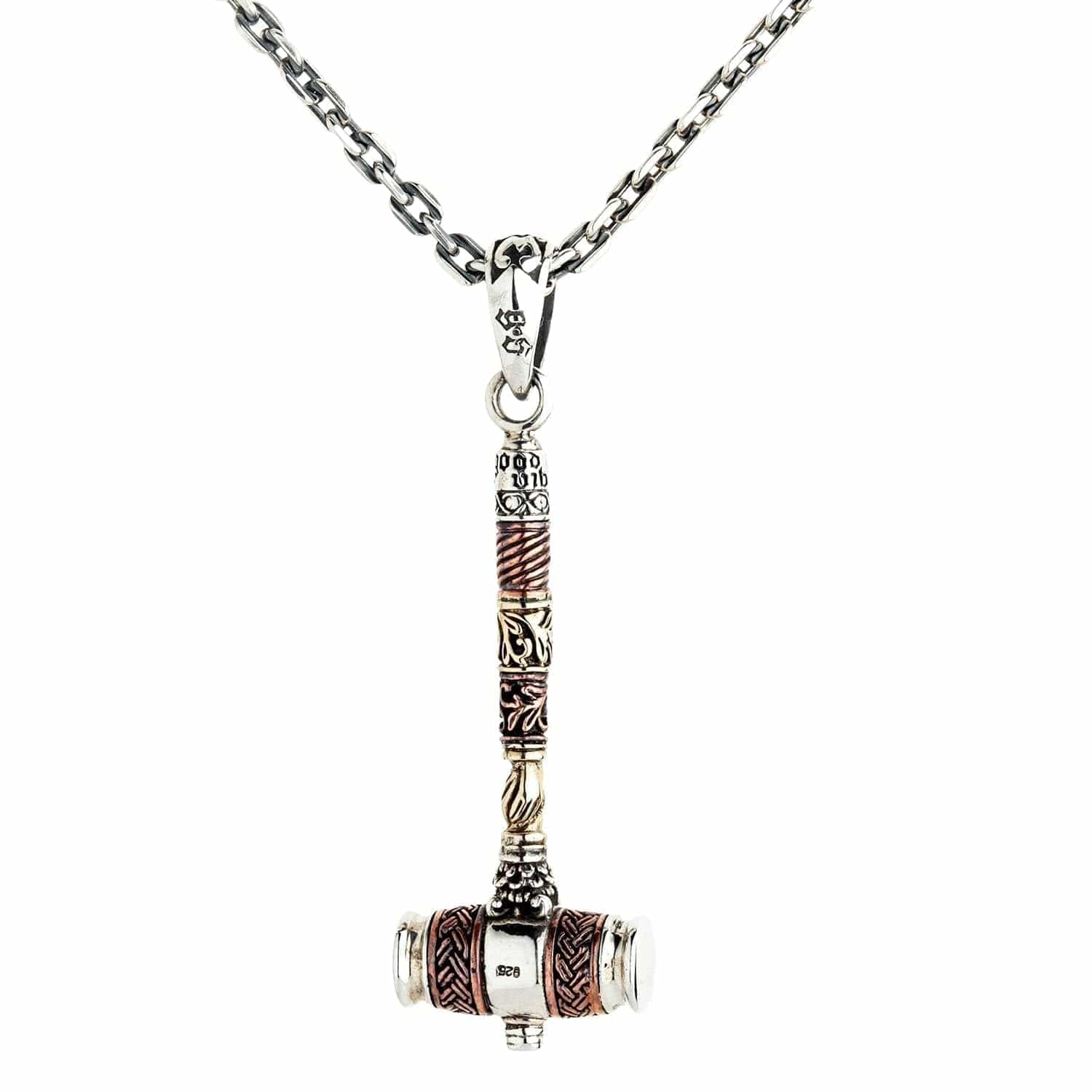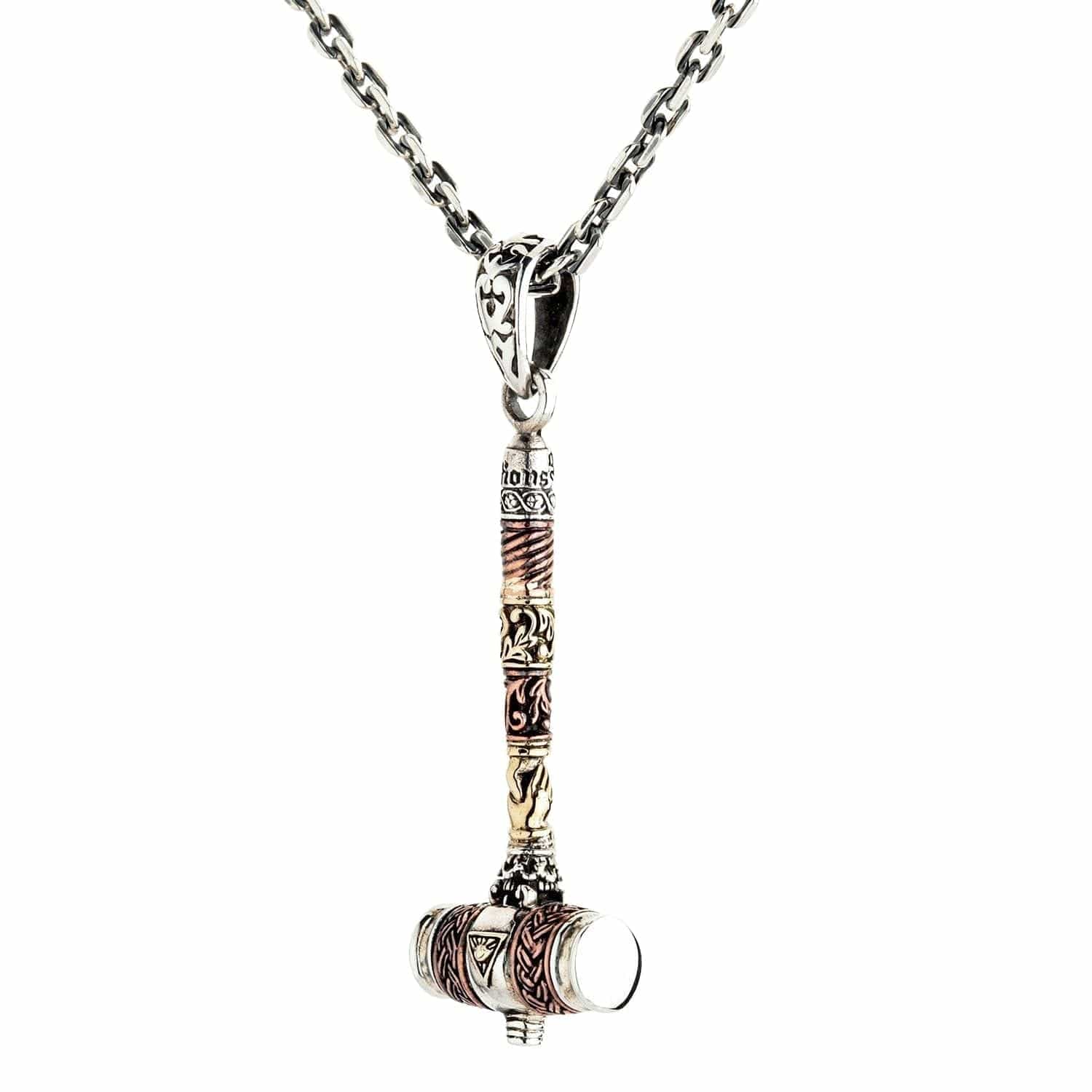 Wapen je met de kracht van Asgard met onze verbluffende Mixed Metal Mjolnir Hanger. Dit is niet zomaar een accessoire; het is een krachtig talisman van kracht en bescherming, geïnspireerd op de legendarische hamer van Thor. Met de hand gemaakt uit massief 925 sterling zilver, valt dit stuk op door zijn ingewikkelde tri-metaal details, waarbij zilver, warm koper en rijk messing worden gecombineerd tot één indrukwekkend stuk Noorse sieraden.