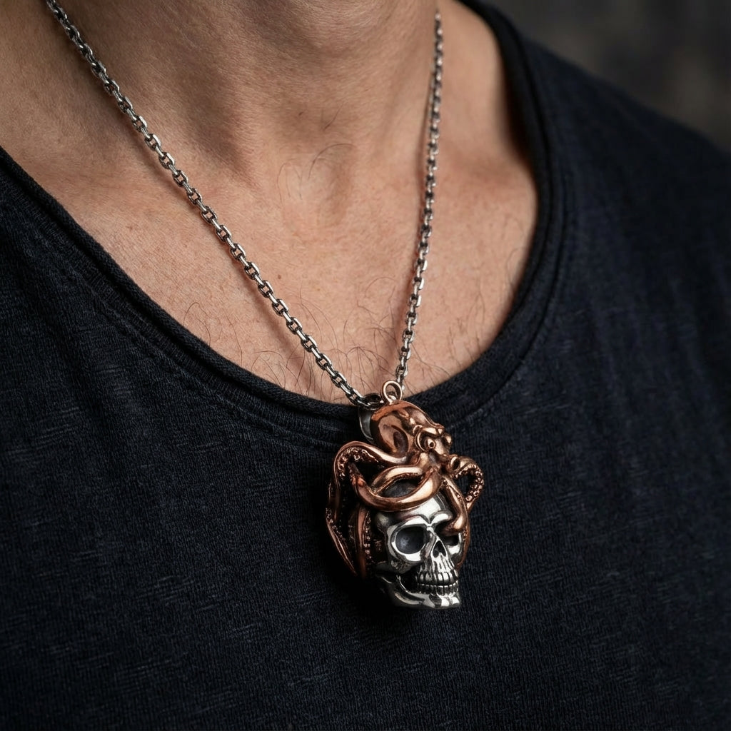 2. Zijn de materialen echt zilver en brons? Ja, dit is een hoogwaardig, massief stuk. De schedel is gemaakt van massief 925 sterling zilver en de octopus van echt gepolijst brons. Dit is geen verguld item, wat zorgt voor een duurzame en authentieke two-tone afwerking die prachtig zal verouderen.
