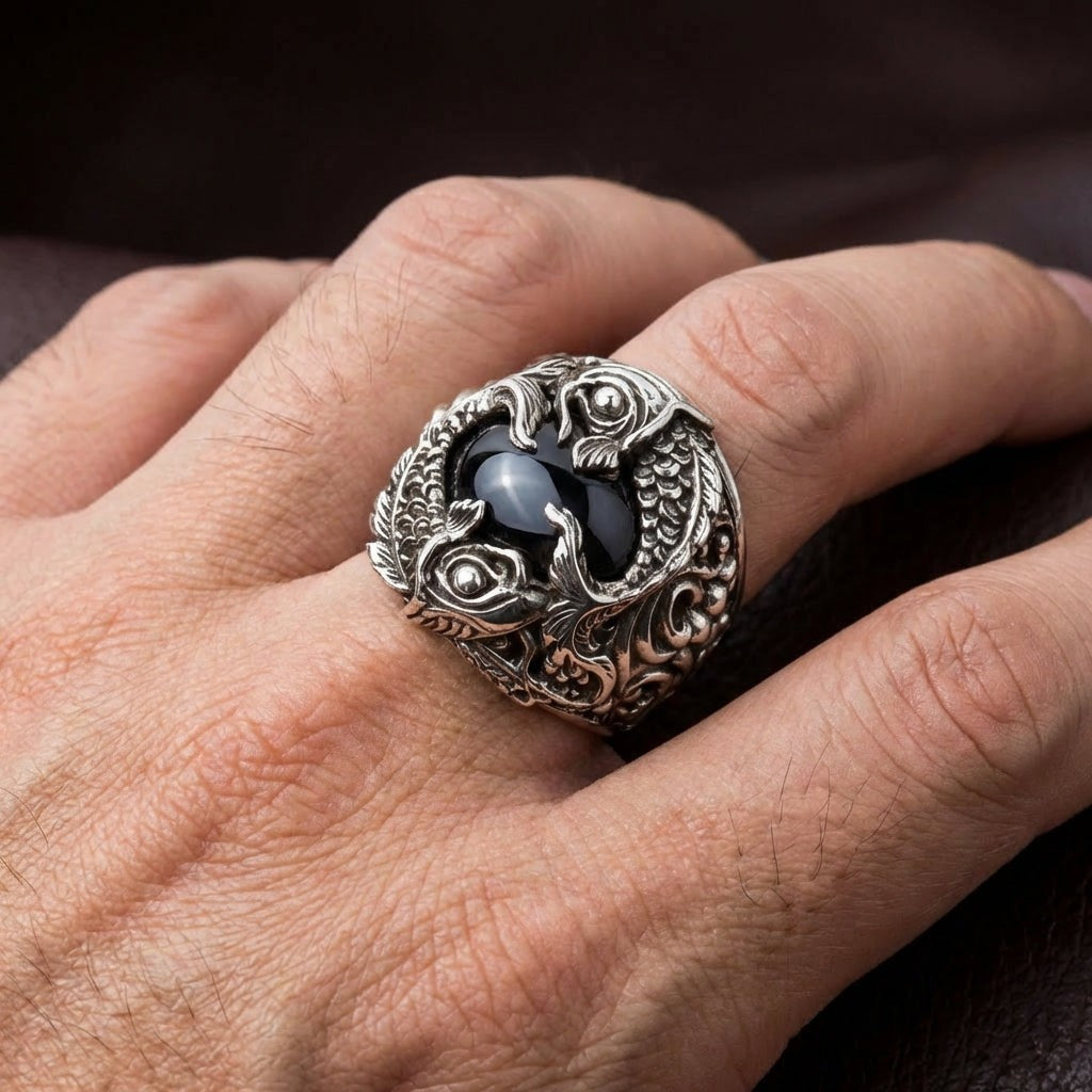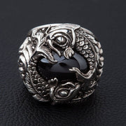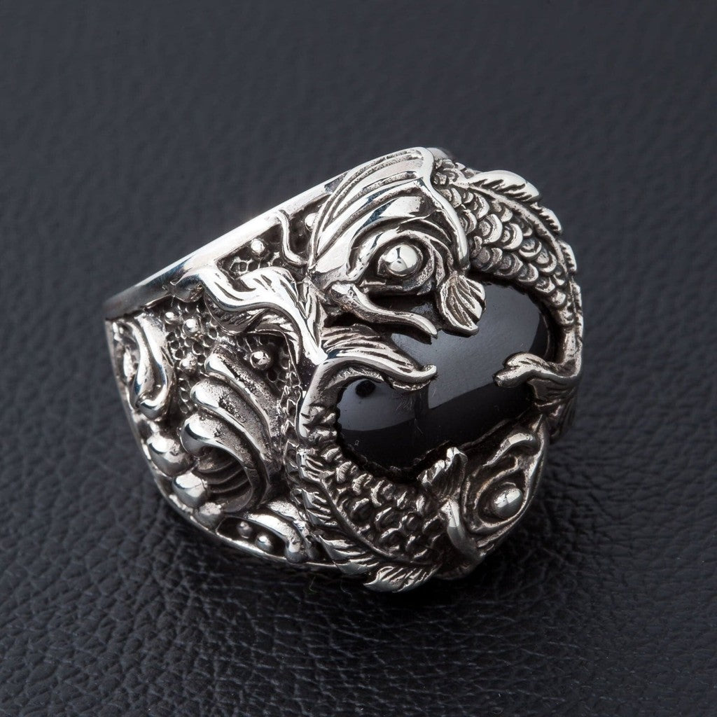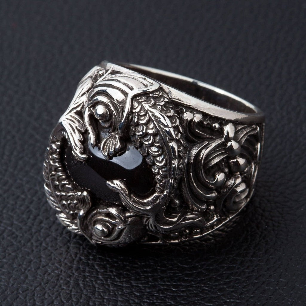 Zwarte Onyx Japanse Koi Sterling Zilveren Gotische Ring