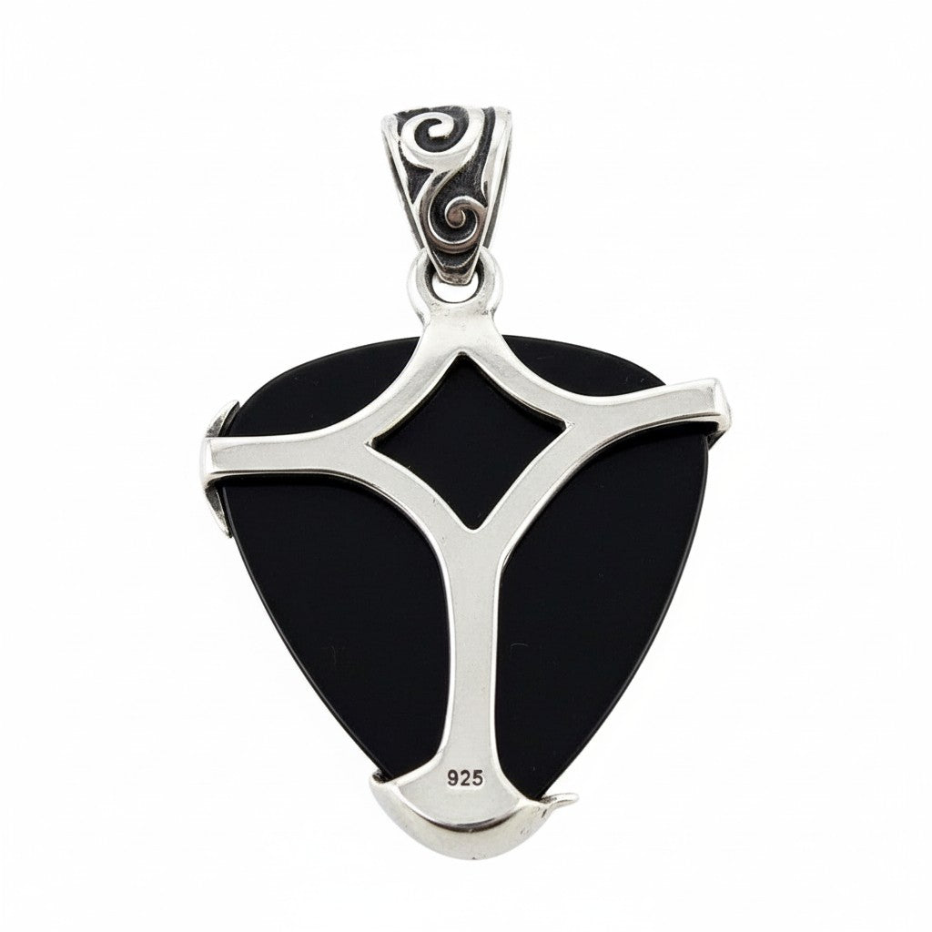 Meer dan alleen kunst: deze hanger is gemaakt voor het podium. Hij is ontworpen om een plectrum van standaardformaat veilig vast te houden, zodat je er nooit zonder zit. Het hele stuk is gesmeed uit massief .925 sterling zilver, met een vakkundig geoxideerde afwerking die het ontwerp een enorme diepte en een stoer, doorleefd karakter geeft. Dit is het toppunt van functionele rock-‘n-roll-sieraden. Ontdek meer essentiële items in onze Music Jewelry-collectie.