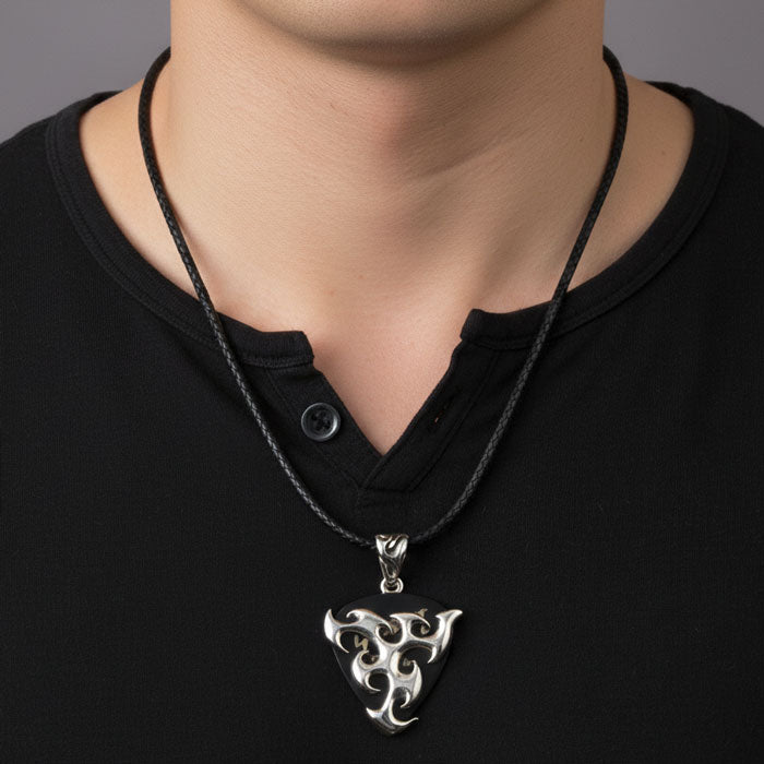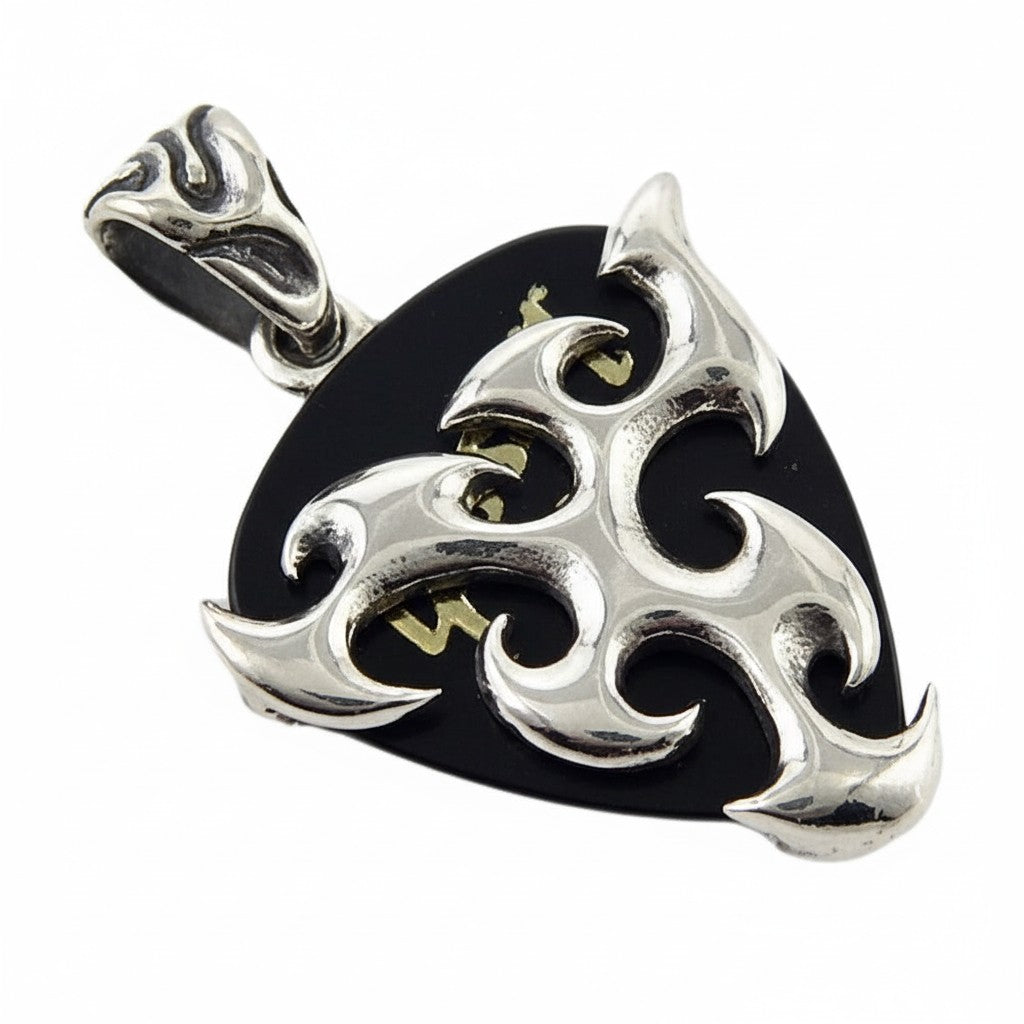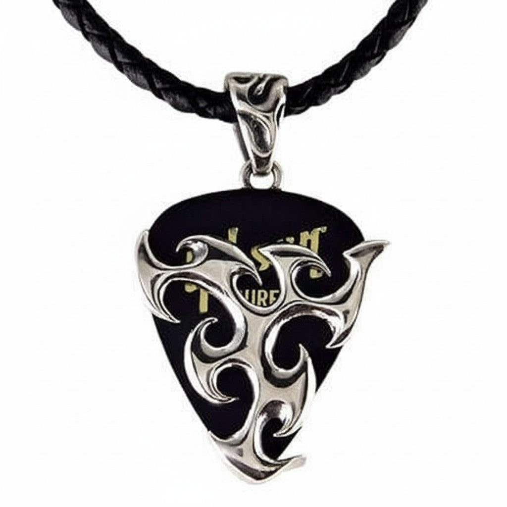 Het frame van de hanger is een meesterwerk van agressief design. Een dynamisch tribal vlammenpatroon met scherpe lijnen en rondingen omhult je plectrum en roept de rauwe energie en passie van een vlammende gitaarsolo op. Het opengewerkte patroon van gestileerde vlammen ziet er niet alleen geweldig uit, maar is ook lichtgewicht en laat de plectrum goed zien.