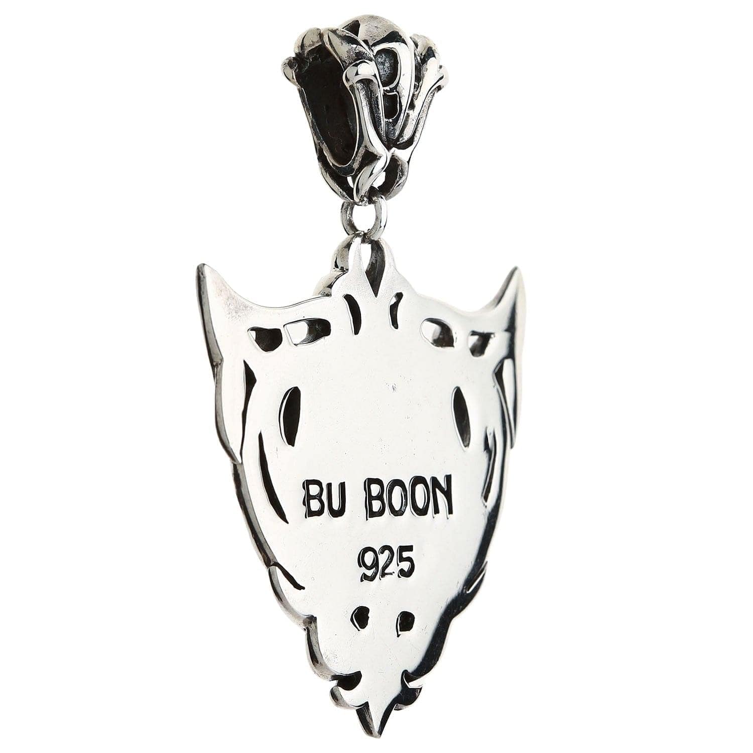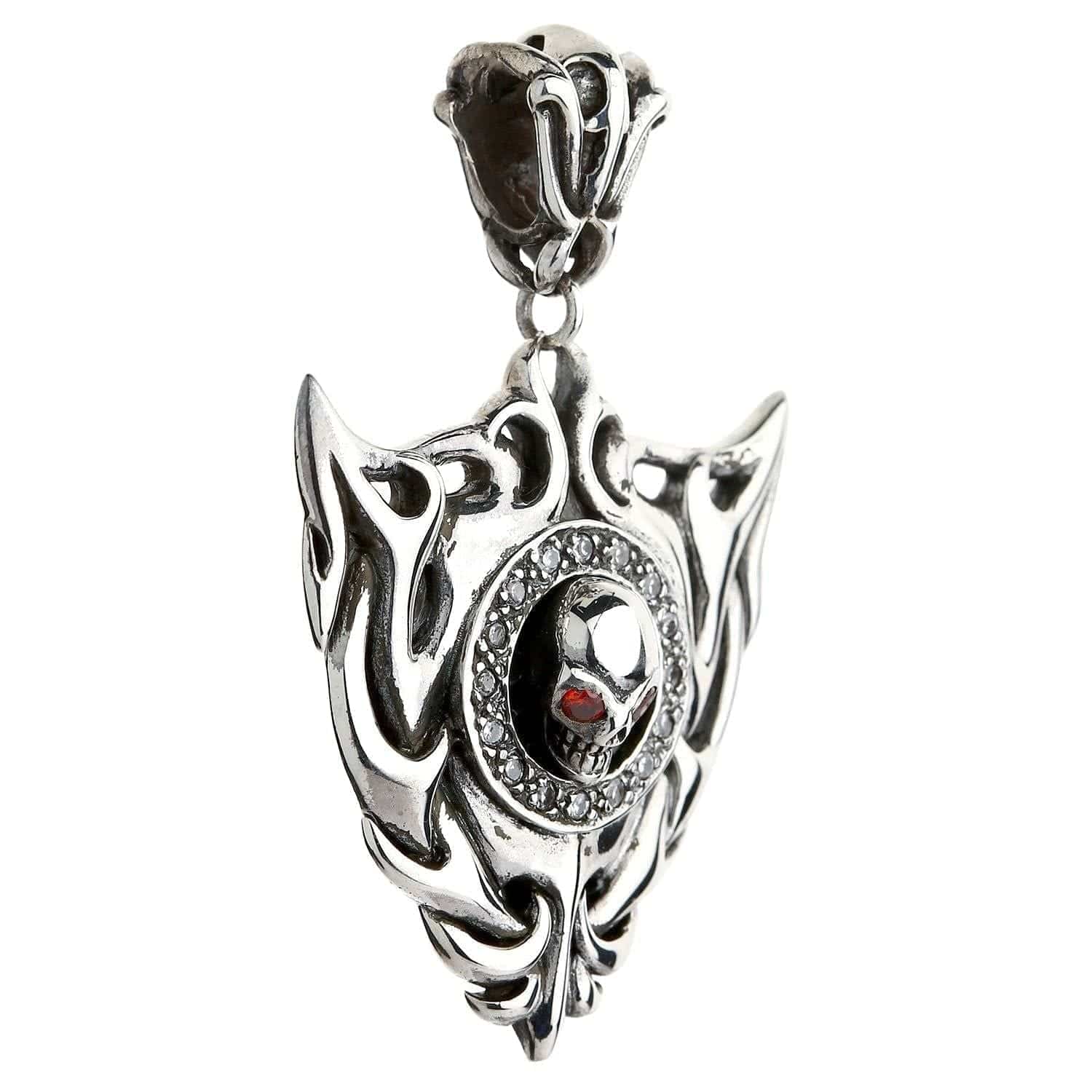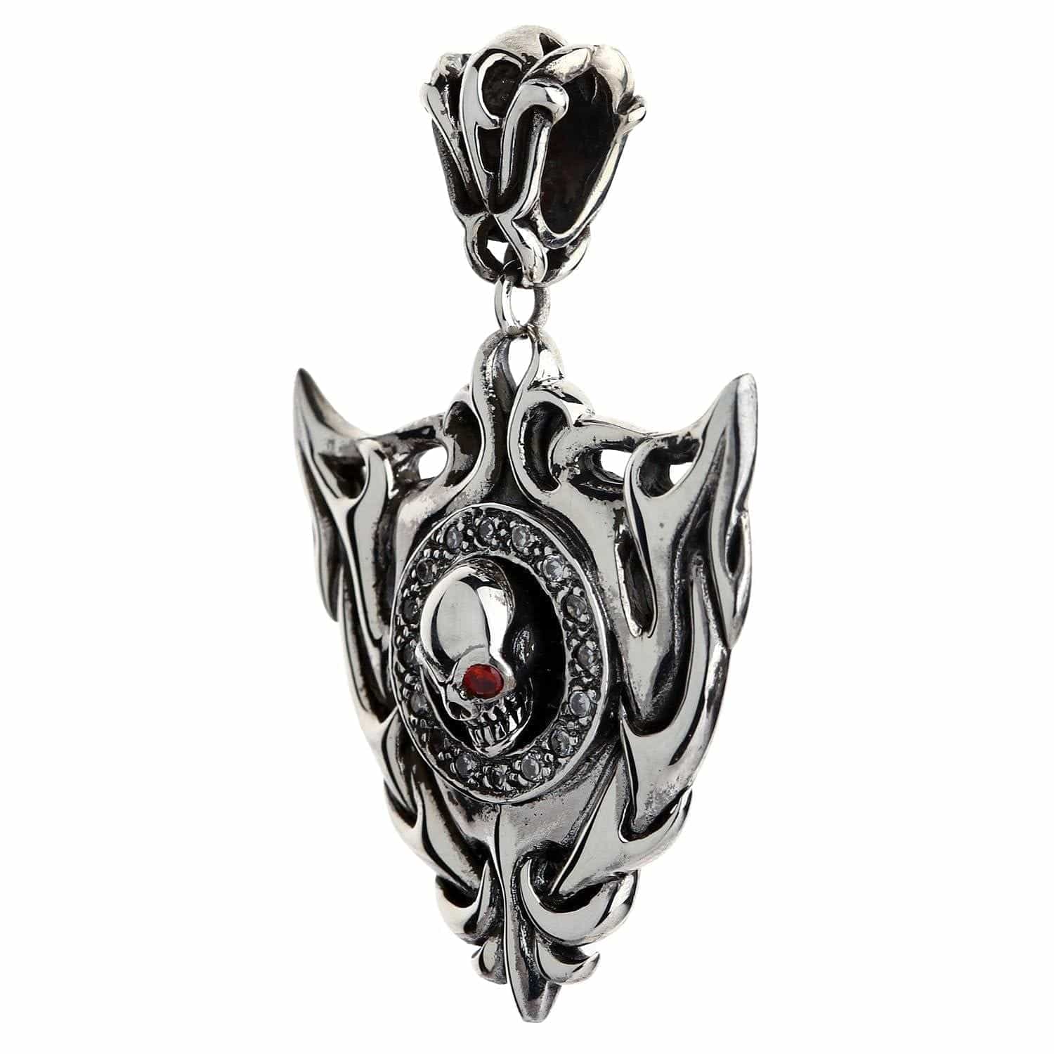 Hele smykket er utformet rundt et solid, beskyttende skjold. Ville, tribale flammedetaljer bryter ut fra midten og slynger seg rundt en truende, polert hodeskalle. Dette er ikke et hvilket som helst sølv hodeskalleanheng; det er et nøye utformet kunstverk. Den sentrale hodeskallen får et gjennomtrengende, hypnotisk blikk med to innfattede, flammende røde CZ-steiner som øyne.