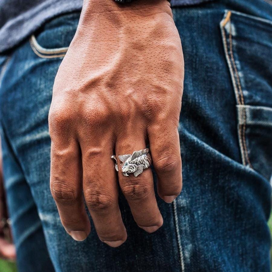 Q: Hvordan fungerer justerbar størrelse? A: Ringen er designet som en åpen ring der hodet og halen på fisken ikke møtes helt. Dette gjør at du forsiktig kan klemme eller trekke i ringen for å finne din perfekte passform innenfor det anbefalte størrelsesområdet (US 6-11). Det gjør den til et flott gavevalg når du ikke er sikker på nøyaktig størrelse.