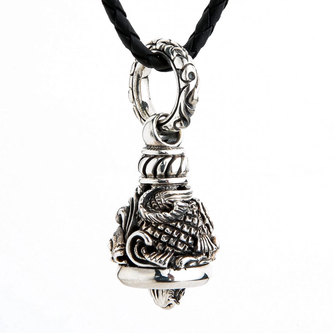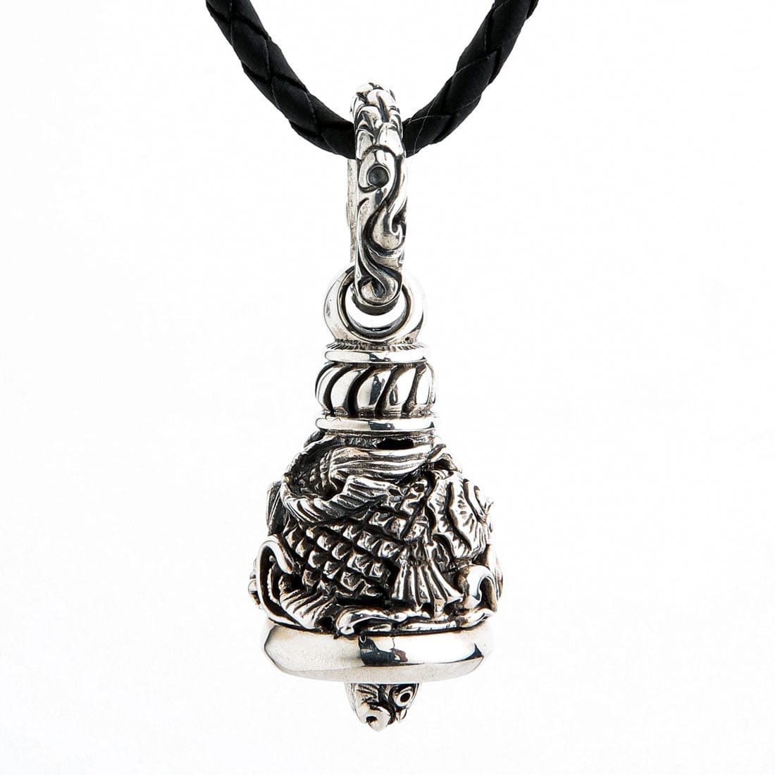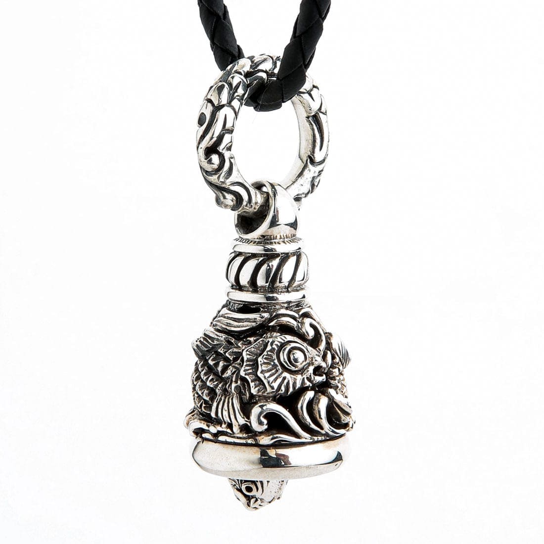 Denne fantastiske bjellen er håndlaget av hele 26 gram massivt sterlingsølv, som gir en ren og klar klang. Inni fortsetter temaet med en liten koi-hode-klokker som tilfører et sjarmerende og kunstnerisk preg. Hele smykket, fra de detaljerte skjellene på Koi-fisken til den utsmykkede hempen, har en polert og oksidert finish for ekstra dybde og et røft, antikt uttrykk. Finn flere kraftfulle beskyttere i vår Guardian Bells-kolleksjon.