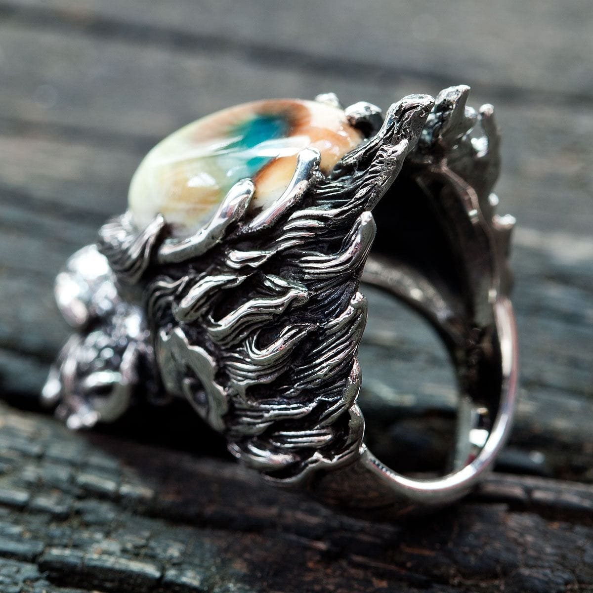 På toppen av dragens hode sitter en stor, ekte Shiva Shell-stein. Også kjent som Shivas tredje øye, er dette naturlige skjellet et sterkt symbol på visdom, åndelig oppvåkning og beskyttelse mot det onde. Den fascinerende naturlige spiralen trekker blikket innover og tilfører smykket en dyp, mystisk energi. Hele ringen er smidd av hele 37 gram massivt .925 sterlingsølv, med en dyktig oksidert finish som gir den et eldgammelt og kraftfullt utseende. Oppdag flere mytiske skapninger i vår Dragesmykker-kolleksjon.