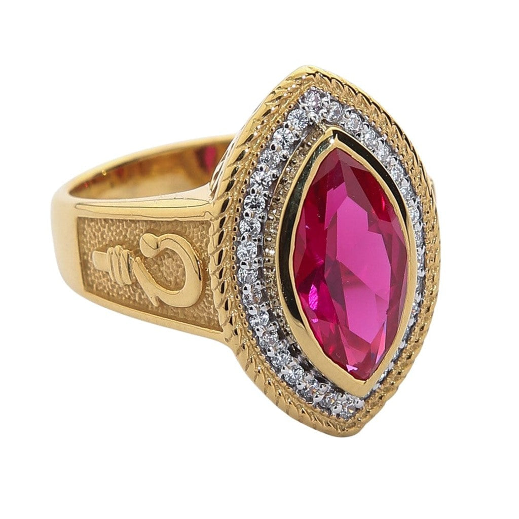 Vi mener at en så praktfull ring kun fortjener de beste materialene. Basen er smidd av massivt .925 sterling sølv, som gir styrke og en strålende glans. Hele smykket er deretter belagt med et tykt mikronlag av rik, gul gull, som gir en luksuriøs og varig finish. Midtpunktet er en førsteklasses, marquise-slepet rød rubin Cubic Zirconia, omgitt av en glorie av glitrende, klare CZ-stener av høy kvalitet.