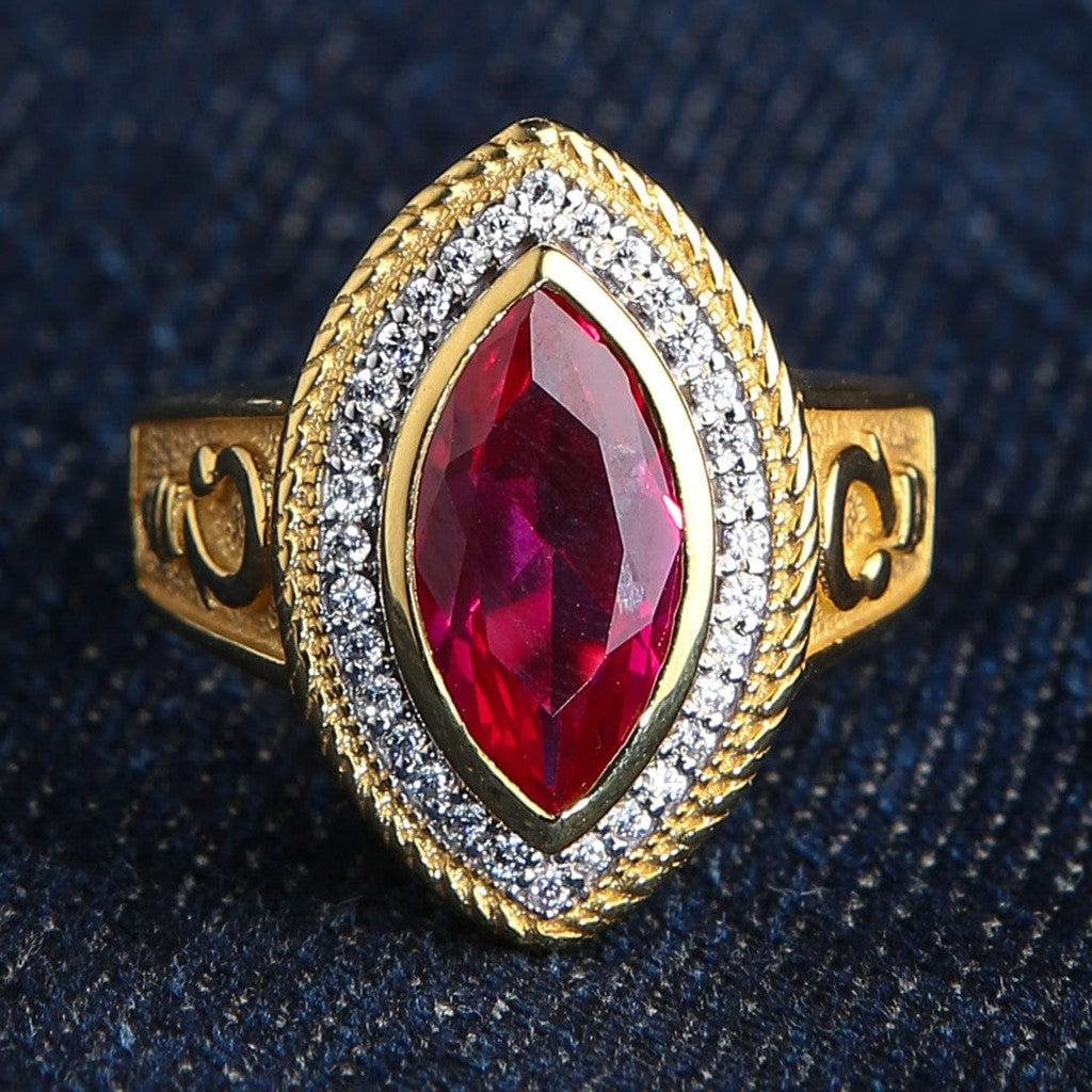 ♦️ Fantastisk markis-slipt rubin: Midtpunktet er en stor, 6mm x 14mm markis-slipt rød rubin CZ-stein, et unikt og elegant snitt som forlenger fingeren og glitrer intenst.