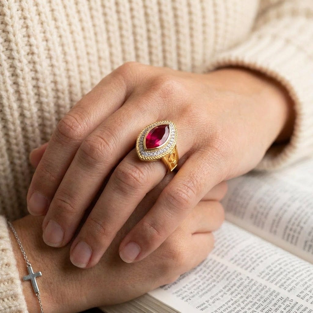 En ring av denne kaliberen kan kun skapes av en mester. Hver ring håndlages individuelt av våre dyktigste håndverkere. De begynner med å sette den praktfulle marquise-slipte rubinen, en delikat og presis prosess. Deretter setter de omhyggelig inn hver av de omkringliggende klare CZ-steinene i glorien. De intrikate stavdetaljene på båndet blir så nøye gravert og polert. Denne dedikasjonen til tradisjonelt, eksklusivt smykkearbeid sikrer at hver fasett er feilfri, noe som gir et smykke av arvestykkekvalitet.