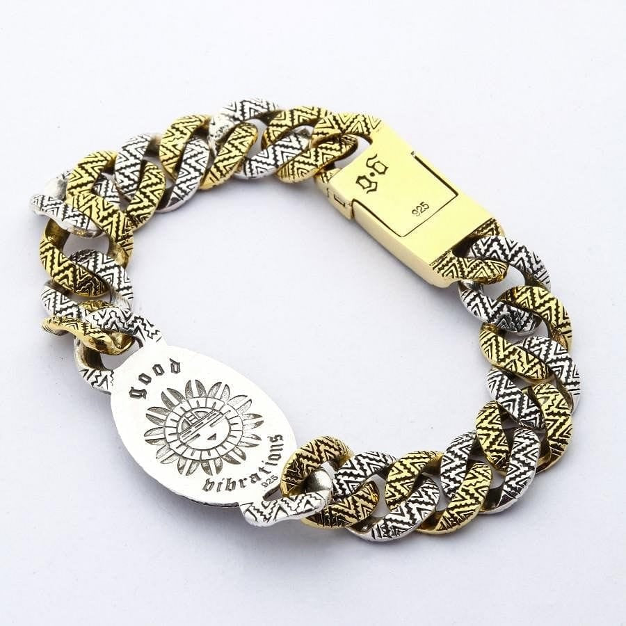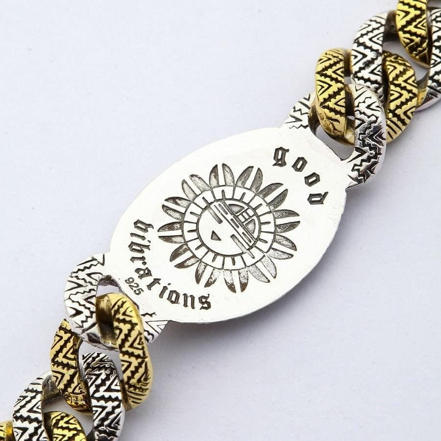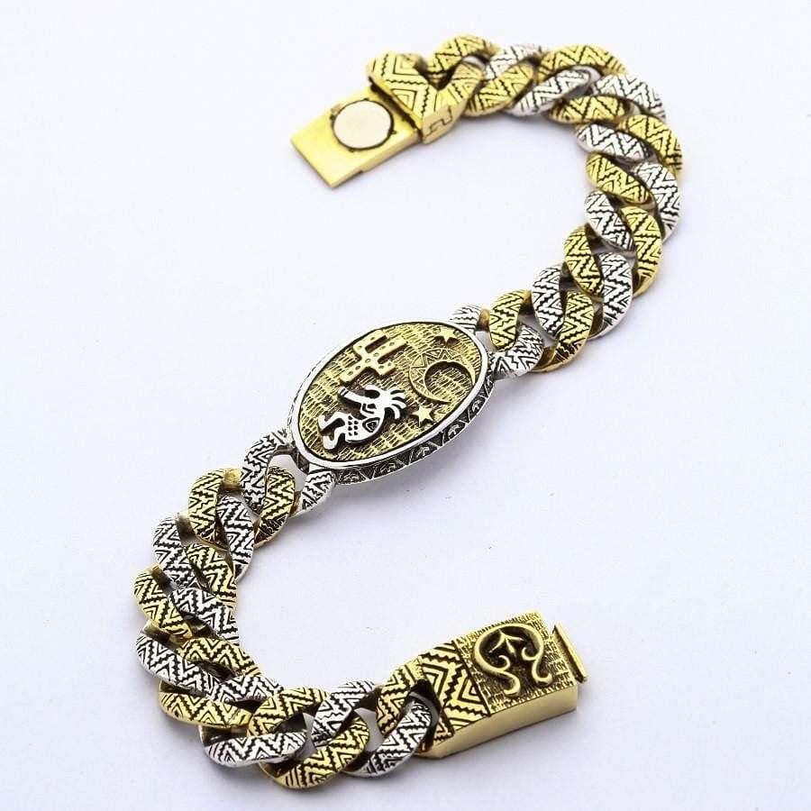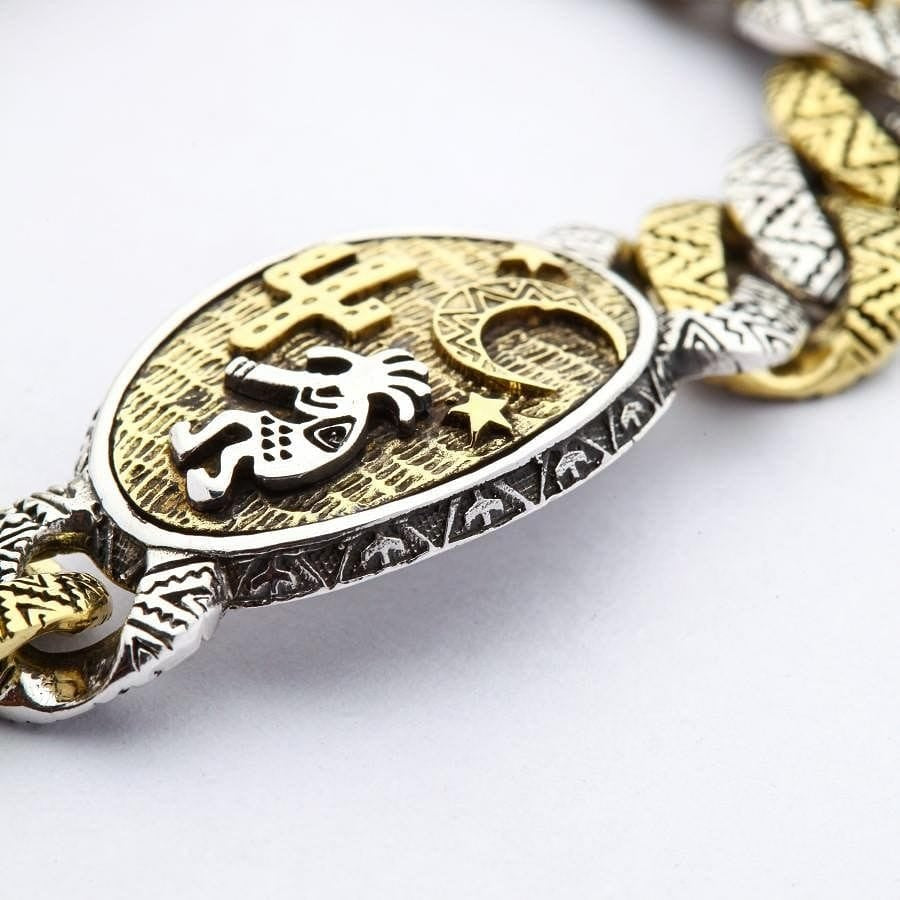 Løft stilen din med vårt Sterling sølv & messing Kokopelli-armbånd. Vakkert håndlaget, dette unike smykket kombinerer elegansen til 925 sølv med iøynefallende gyllen messing, som gir en slående to-farget effekt. Armbåndet har en karakteristisk tribal Kokopelli-figur på en oval plate, et symbol på glede og velstand. Med sin solide vekt på 55 gram og detaljerte graveringer, passer det både til hverdags og spesielle anledninger. Sikker lås med stemplet 925-lås gjør dette til en bemerkelsesverdig gave for elskere av unike smykker.