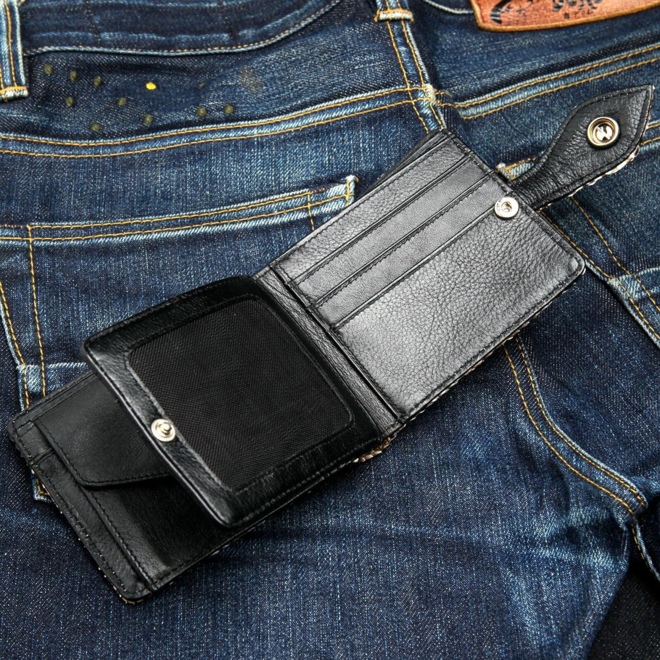 🔥 Srebrne elementy: Ozdobiony unikalnym, masywnym zapięciem z płomieniem ze srebra próby .925 (concho) oraz dopasowanym srebrnym oczkiem do bezpiecznego mocowania łańcucha do portfela.