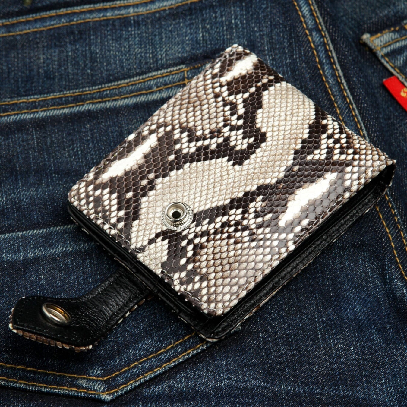P: Czym jest portfel biker snake? O: Portfel biker snake taki jak ten łączy egzotyczny, buntowniczy wygląd skóry węża z praktycznymi cechami potrzebnymi motocykliście. Obejmuje solidną konstrukcję, kompaktowy rozmiar idealny do tylnej kieszeni oraz oczko do bezpiecznego przymocowania łańcuszka, by zapobiec zgubieniu podczas jazdy.