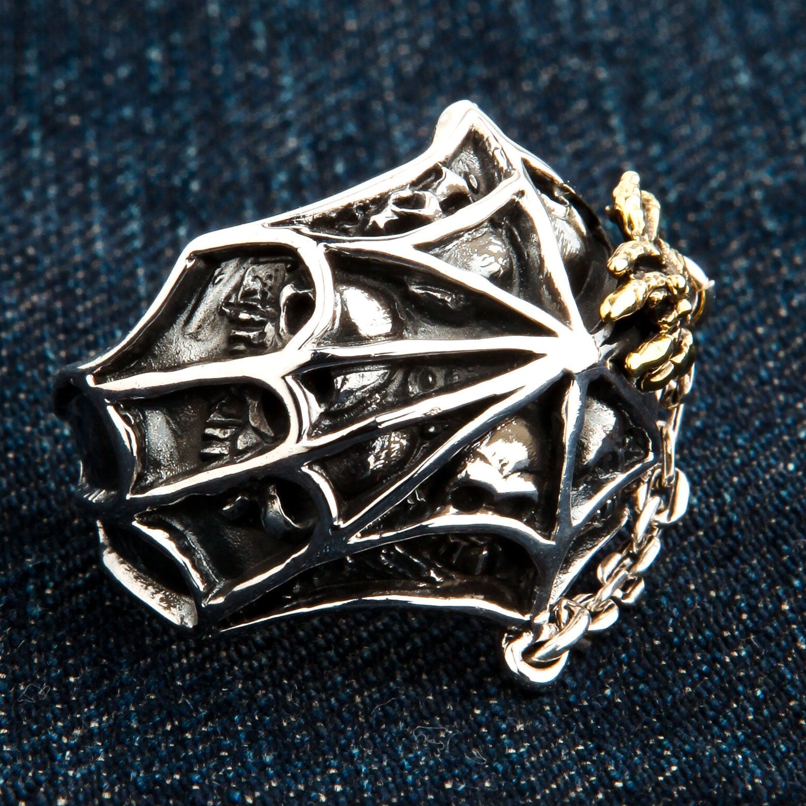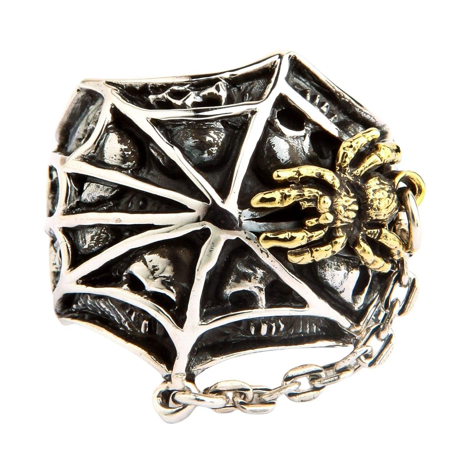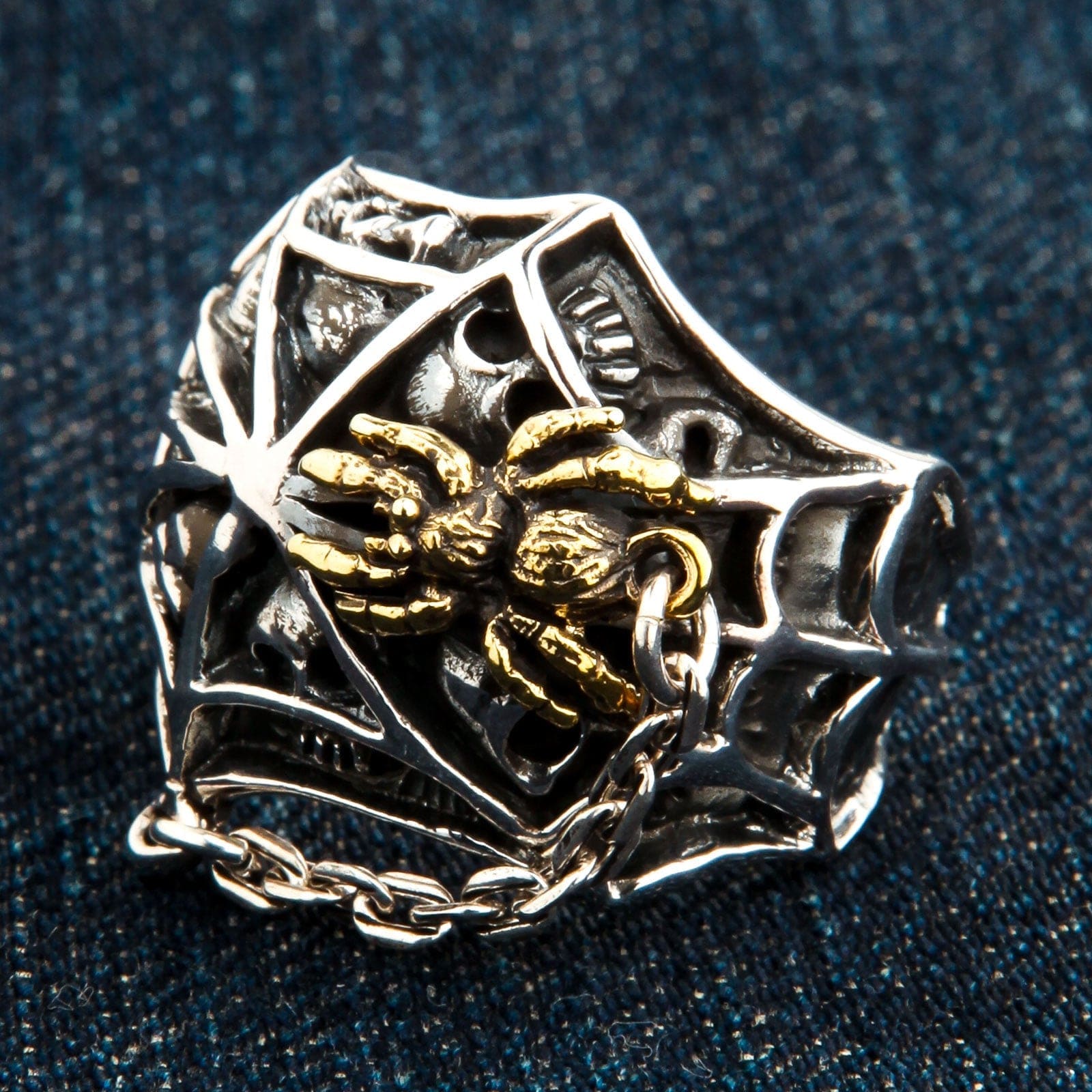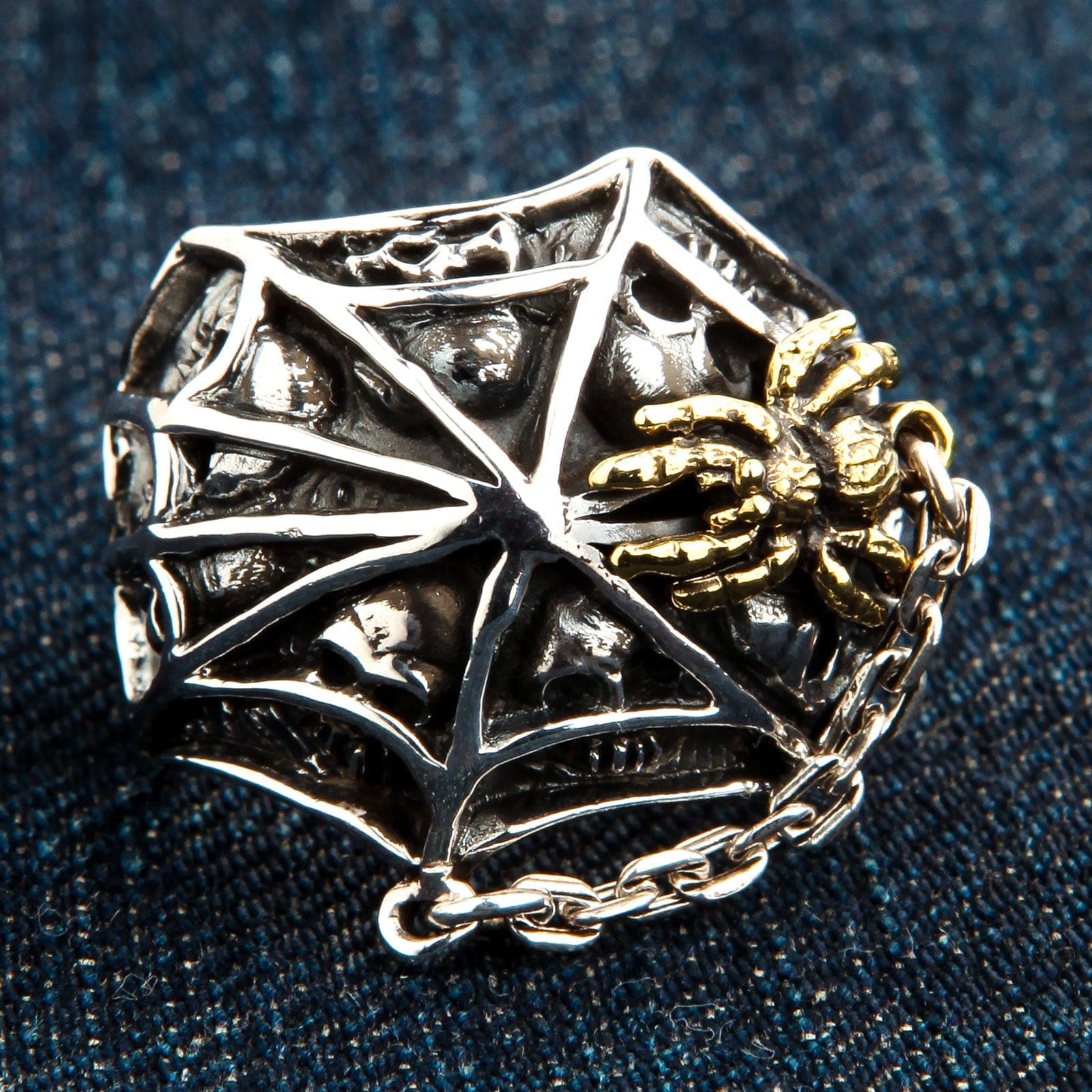 Projekt tego pierścienia to mistrzostwo gotyckiej symboliki. Cała tarcza to dramatyczna, trójwymiarowa pajęczyna, której wypolerowane srebrne nici lśnią na tle ciemnej, oksydowanej otchłani. Przyjrzyj się bliżej cieniom, a odkryjesz mroczne trofea sieci: liczne, misternie wyrzeźbione czaszki uwięzione w jej splotach, stanowiące potężne przypomnienie o naszej wspólnej śmiertelności. Nad tym przejmującym obrazem czuwa sama mistrzyni tkania — wspaniała pajęczyca pokryta bogatym złotem 14k, tworząc olśniewający i luksusowy kontrast. Mały, zwisający łańcuszek dodaje całości detalu i ruchu. Ważący solidne 18 gramów, ten pierścień to prawdziwe dzieło sztuki użytkowej, opowiadające mocną historię o życiu, śmierci i przeznaczeniu.
