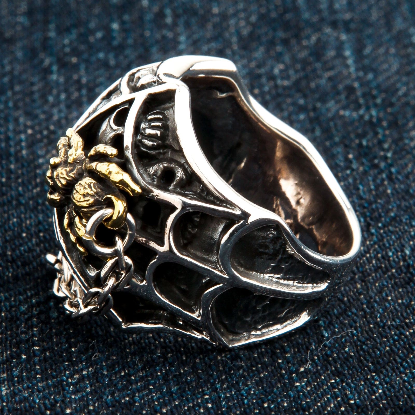 💀 Ukryte detale czaszki: Misternie rzeźbione czaszki subtelnie wplecione są w projekt pajęczyny, tworząc mroczny motyw memento mori, który ujawnia się przy bliższym spojrzeniu.