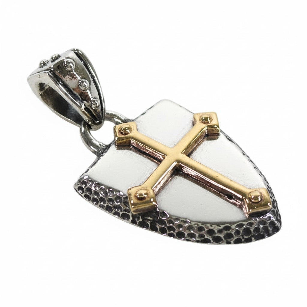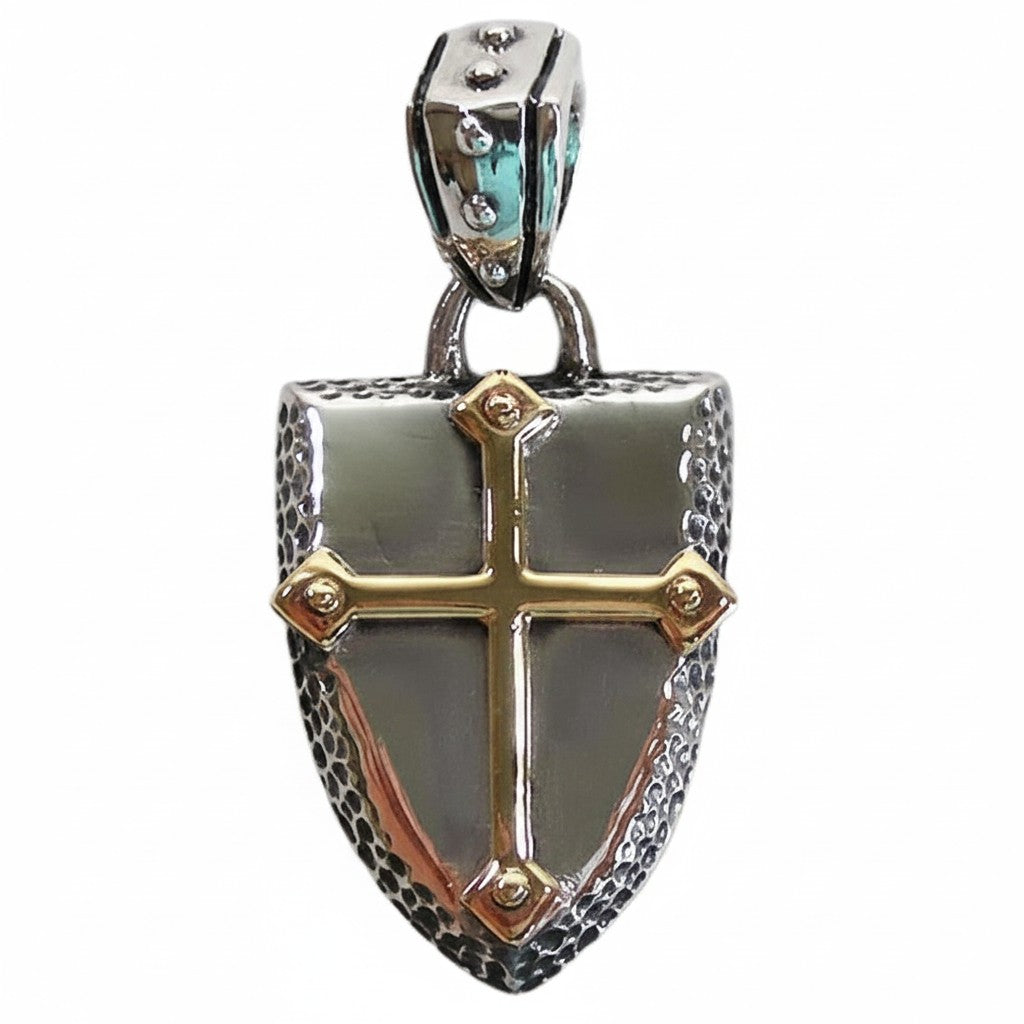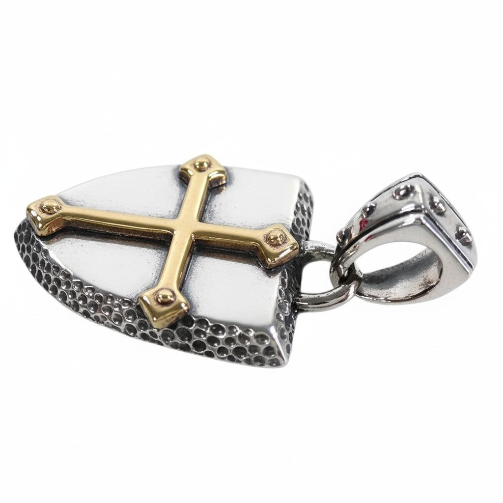 🛡️ Motyw Świętego Wojownika: Potężny i symboliczny wisior z klasyczną tarczą rycerską typu heater oraz wyrazistym krzyżem, ucieleśniający ducha krzyżowca lub templariusza.