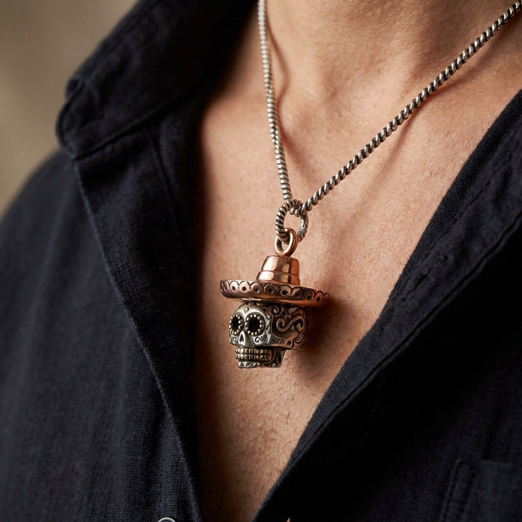 Świętuj życie i oddaj hołd tradycji z naszym barwnym meksykańskim wisiorkiem z czaszką. To coś więcej niż zwykła biżuteria z motywem czaszki – to miniaturowe dzieło sztuki ludowej inspirowane kolorowymi tradycjami Dia de los Muertos (Dnia Zmarłych). Ręcznie wykonany z trzech różnych metali, ten wisiorek jest odważnym wyrazem kultury, pamięci i artyzmu.