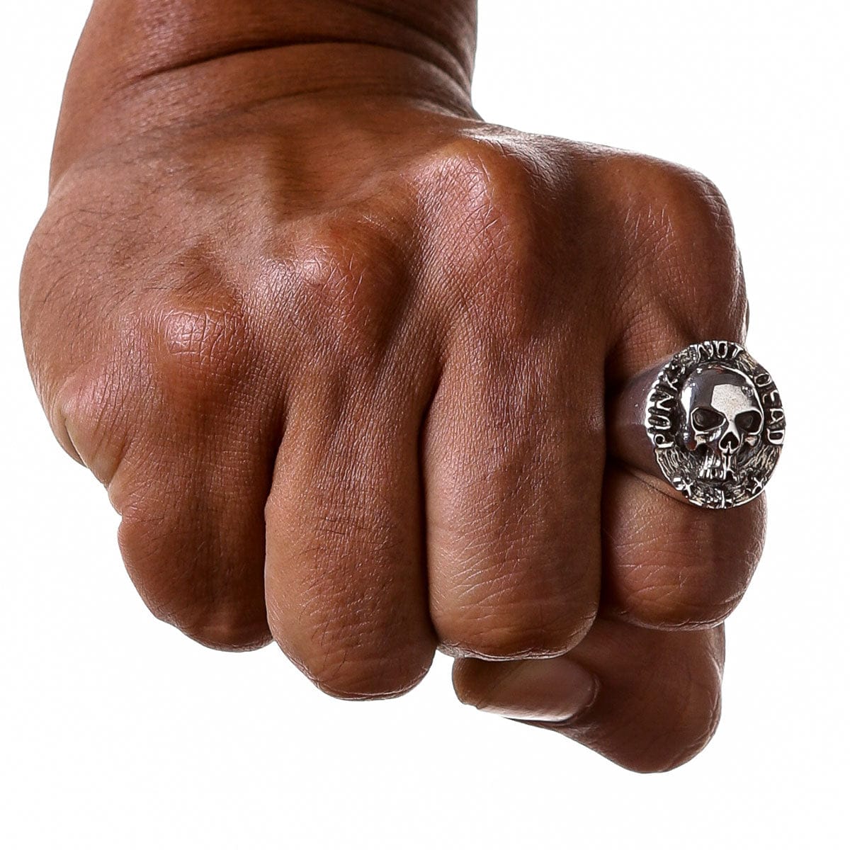 💀 Ikoniczny wzór "Punk Not Dead": Wyrazisty pierścień sygnetowy z błyszczącą czaszką w centrum, otoczoną legendarnym, głęboko wygrawerowanym napisem „Punk Not Dead” – ostateczny hymn buntu.