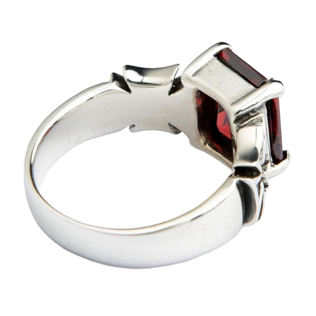 Ten pierścień to przede wszystkim zachwycający kontrast. Ogromny, prostokątny granat 11 mm x 13 mm zajmuje centralne miejsce, a jego głęboko czerwone fasety odbijają światło ognistym blaskiem. Kamień jest wysoko osadzony, a po bokach znajdują się kultowe Krzyże Żelazne. Krzyże są oksydowane, by stworzyć ciemną, surową głębię, która podkreśla błyszczące srebrne krawędzie. To pierścień wyrazisty, który perfekcyjnie łączy gotycki charakter z nutą klasycznej elegancji.