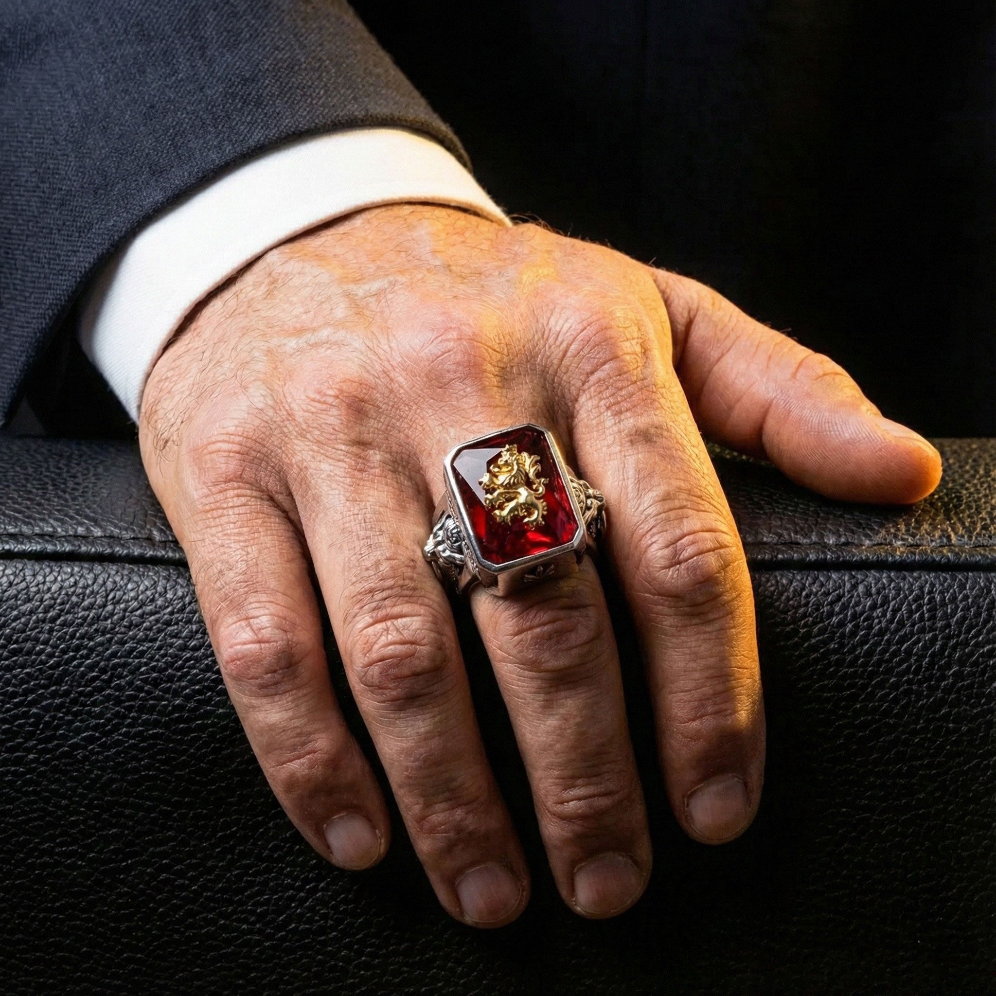 💎 Głęboko czerwona oprawa kamienia: Lew osadzony jest na dużym, fasetowanym kamieniu czerwonej cyrkonii o szlifie szmaragdowym, nadając całości królewskiego luksusu.