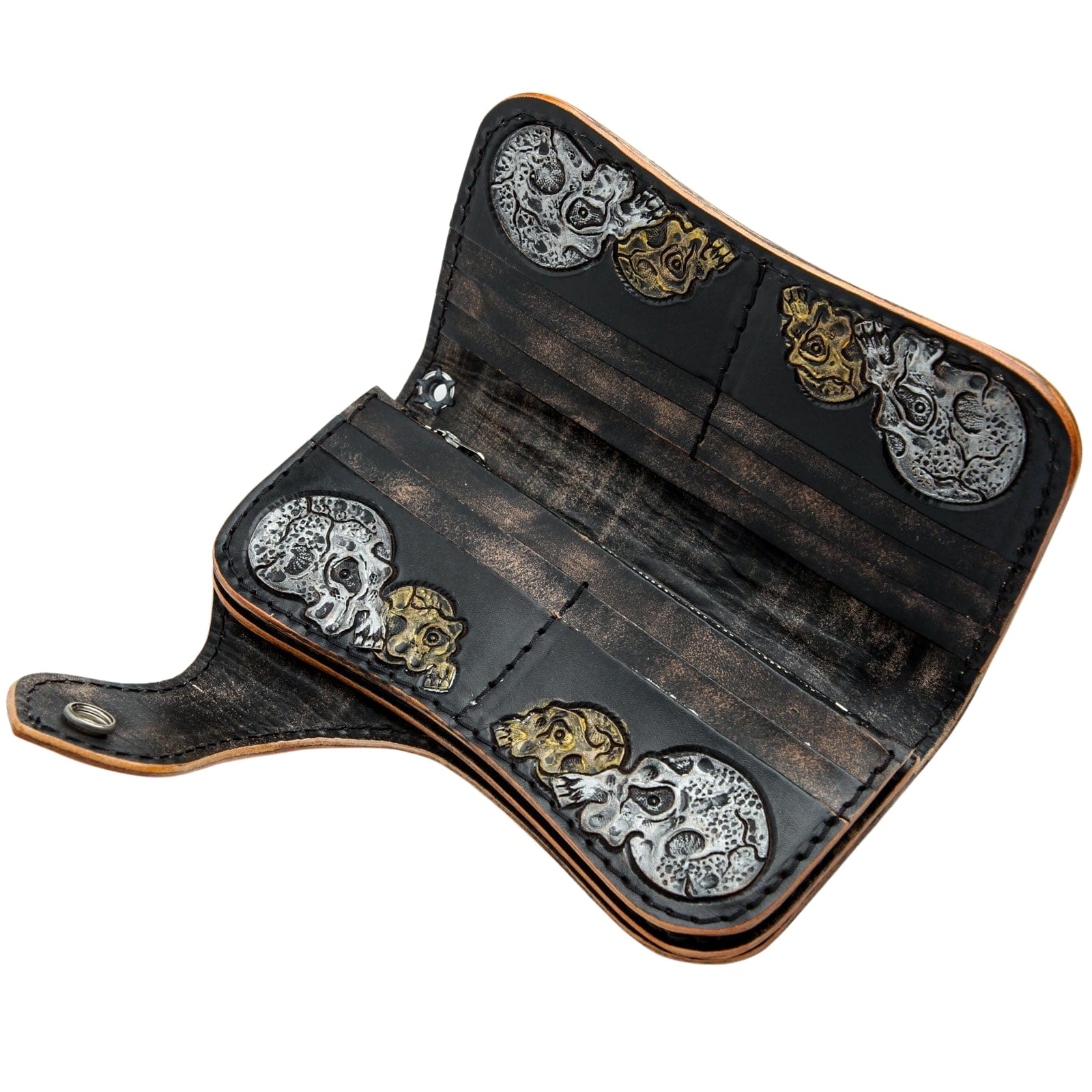 The front of the black leather biker wallet featuring a detailed, hand-carved design of a skeleton skull.