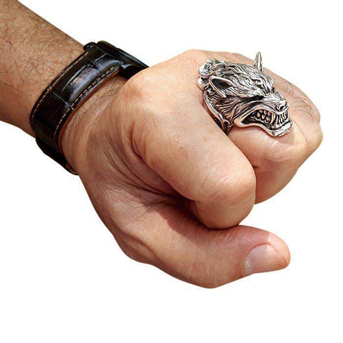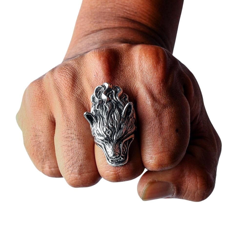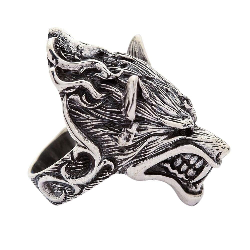 P: Czym ten pierścień różni się od zwykłego pierścienia z głową wilka? O: Zwykły pierścień z głową wilka symbolizuje lojalność, rodzinę i instynkt watahy, natomiast ten pierścień z wilkołakiem reprezentuje coś znacznie dzikszego i nadprzyrodzonego. Projekt jest celowo bardziej potworny i dziki, z przesadnie dużymi kłami i wściekłym wyrazem pyska, oddając grozę i pierwotną siłę legendy o zmiennokształtnym, a nie tylko naturalnego zwierzęcia.