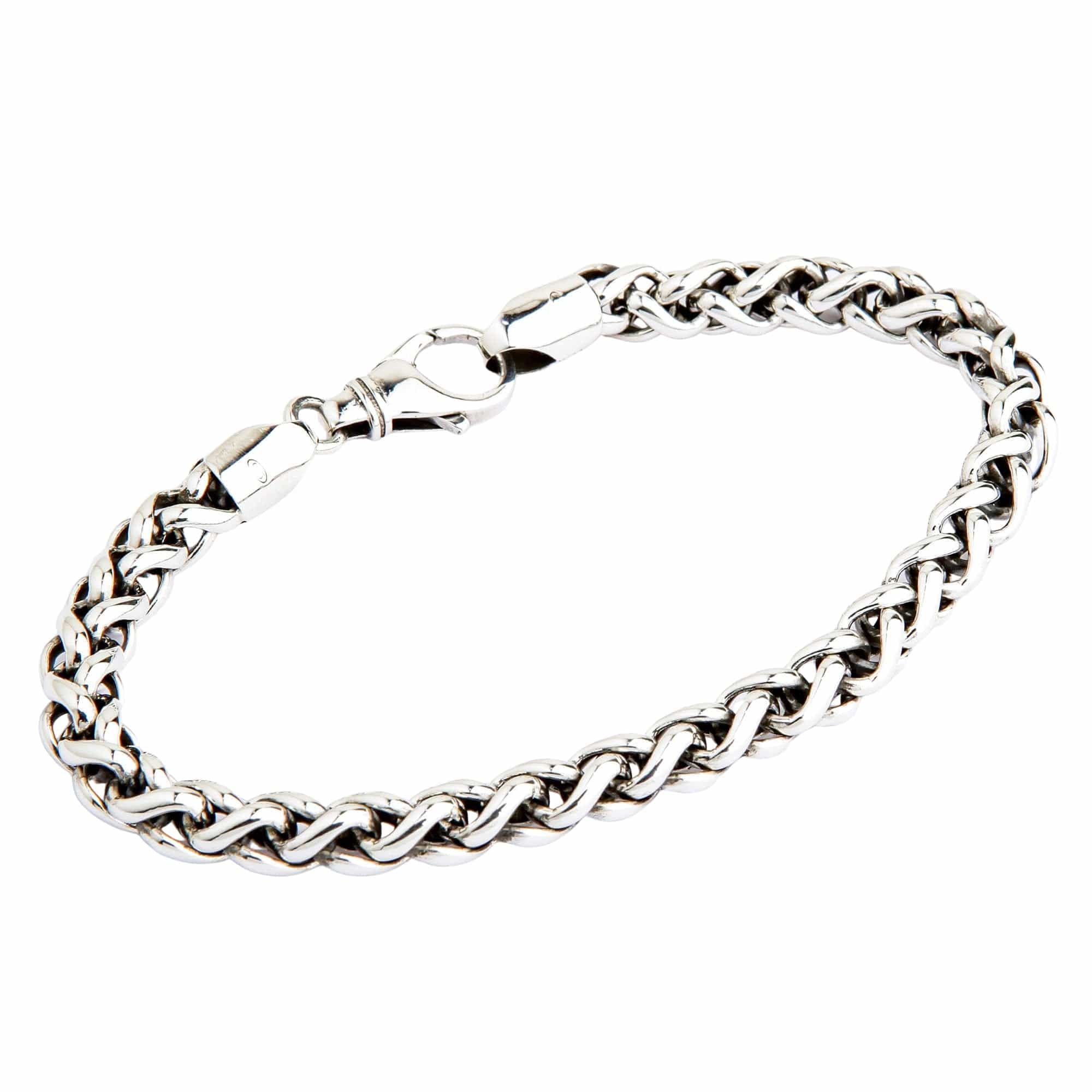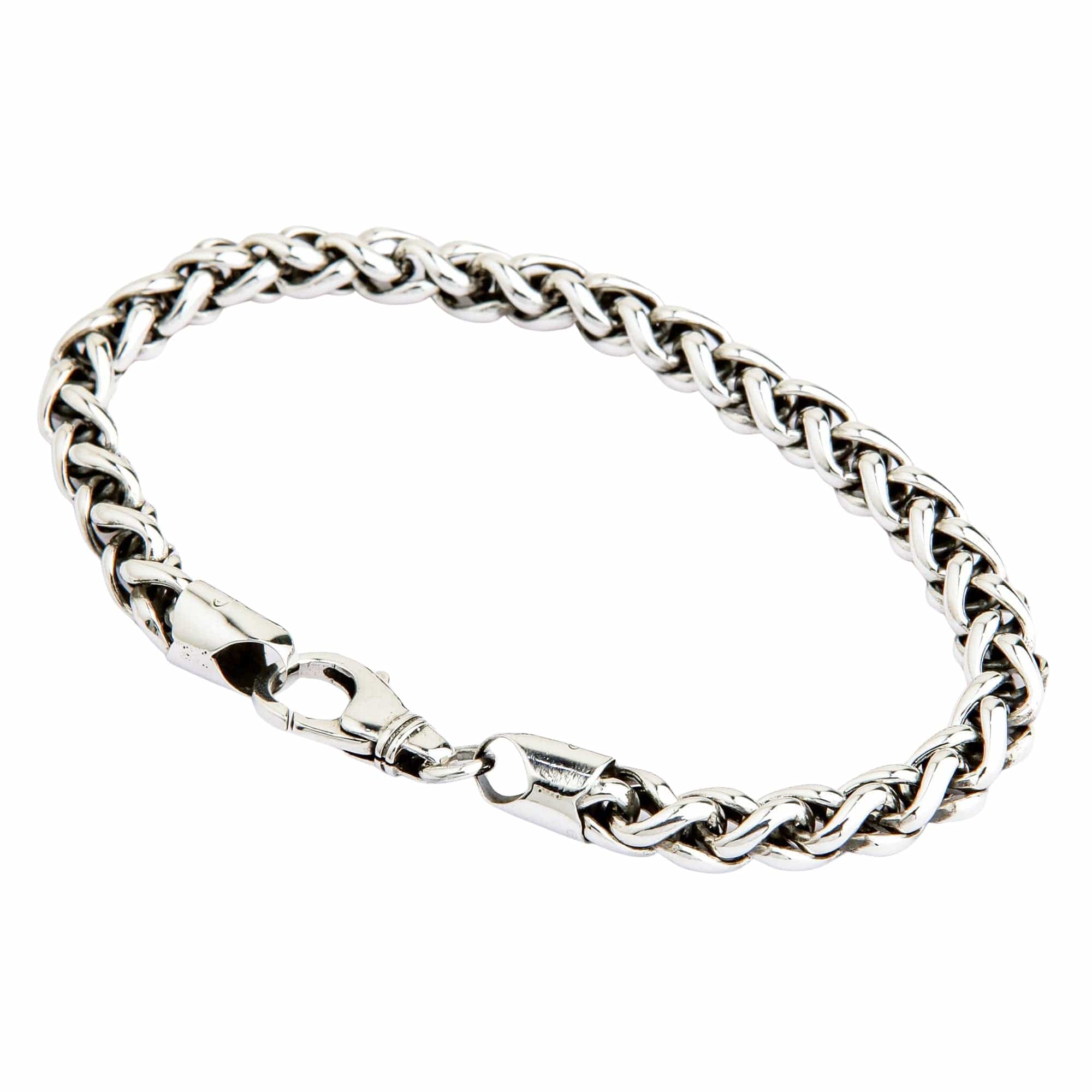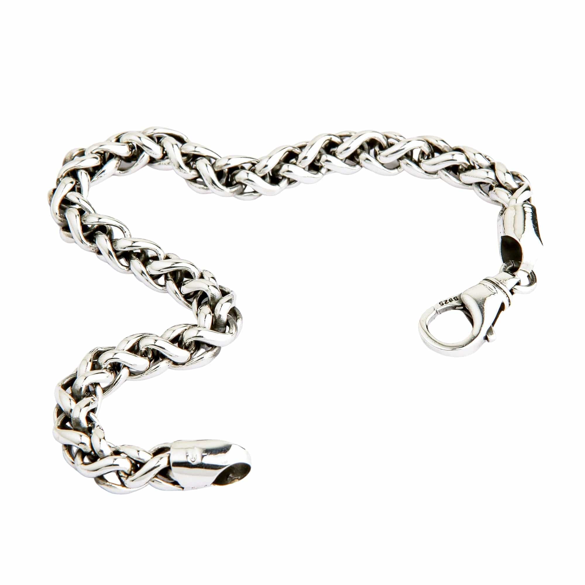 The beauty of this solid silver braided bracelet lies in its complex, woven silver design. The "braided rope" style is a classic Spiga chain, known for its four-sided construction that catches light from every angle. It's a design prized for its durability and fluid feel. Polished to a high shine, this men's silver link bracelet is bold enough to be worn alone, yet its 6.5mm profile is perfect for stacking alongside your watch or other bracelets.