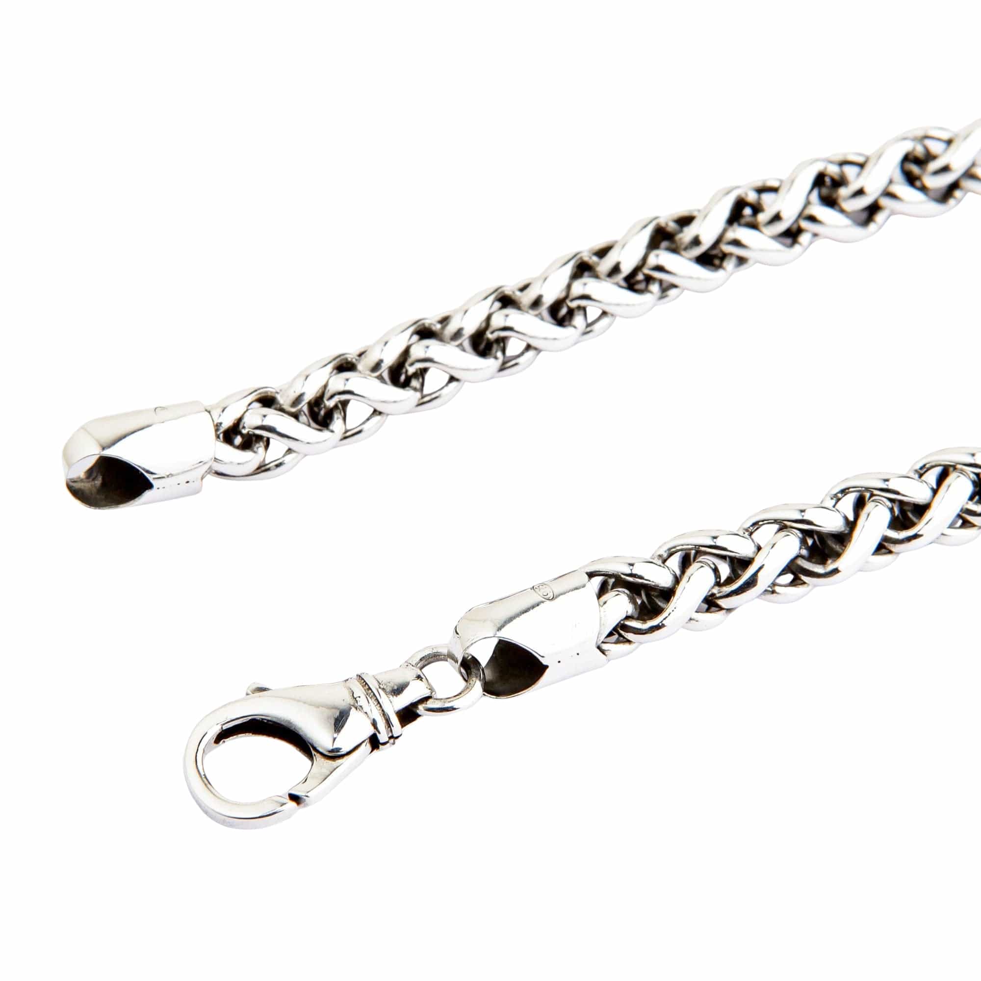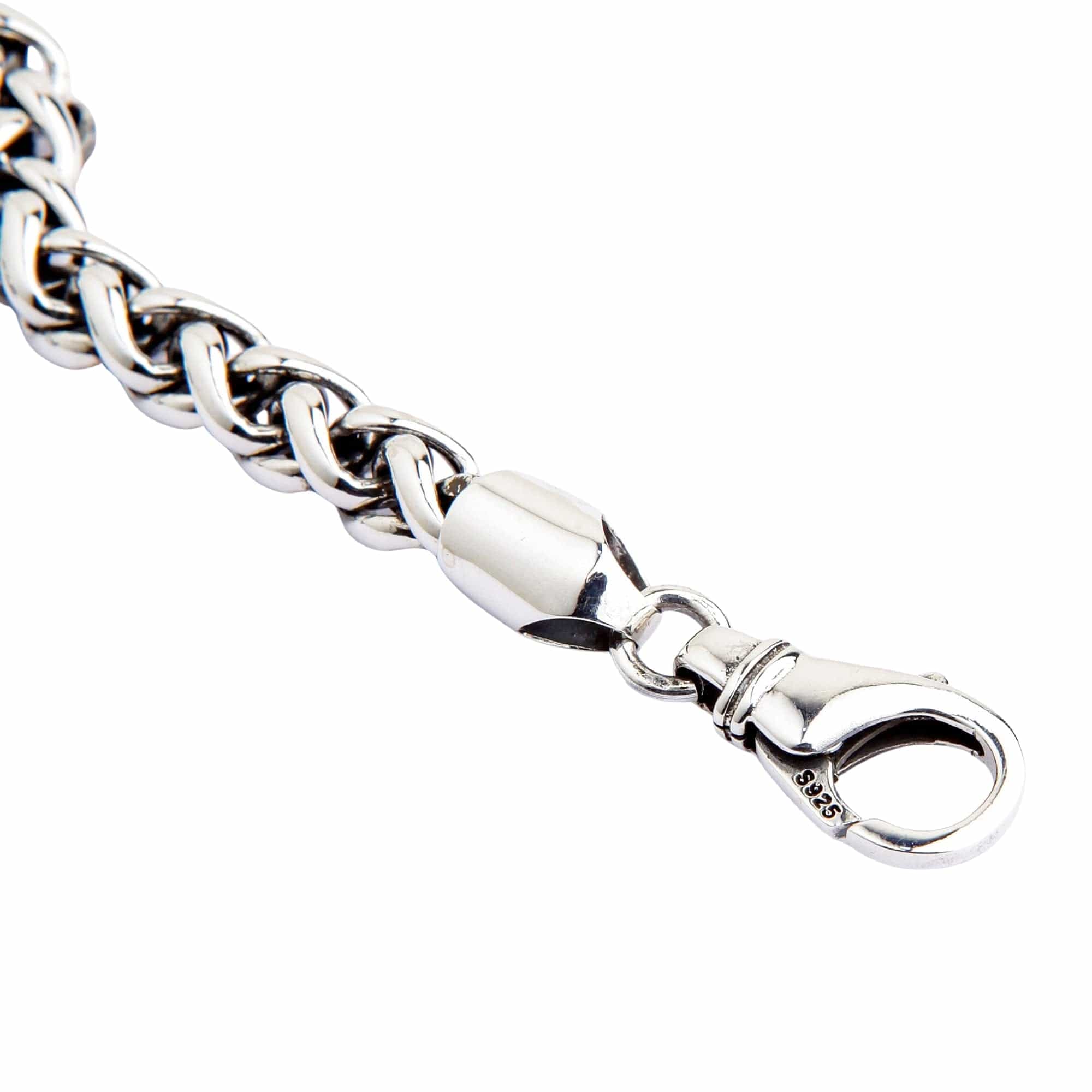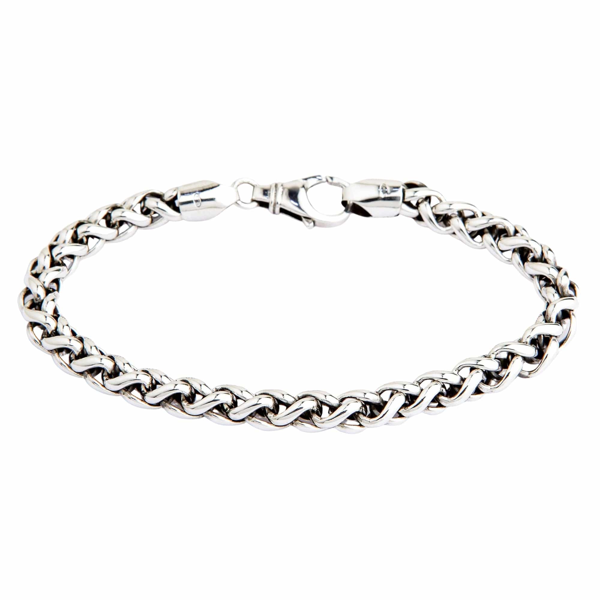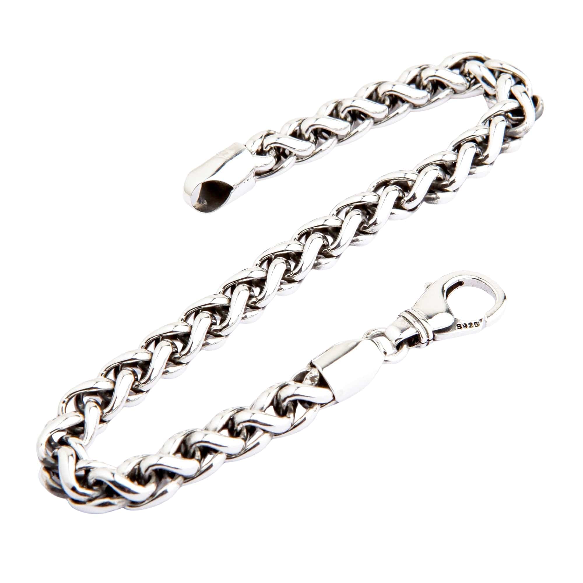 The beauty of this solid silver braided bracelet lies in its complex, woven silver design. The "braided rope" style is a classic Spiga chain, known for its four-sided construction that catches light from every angle. It's a design prized for its durability and fluid feel. Polished to a high shine, this men's silver link bracelet is bold enough to be worn alone, yet its 6.5mm profile is perfect for stacking alongside your watch or other bracelets.