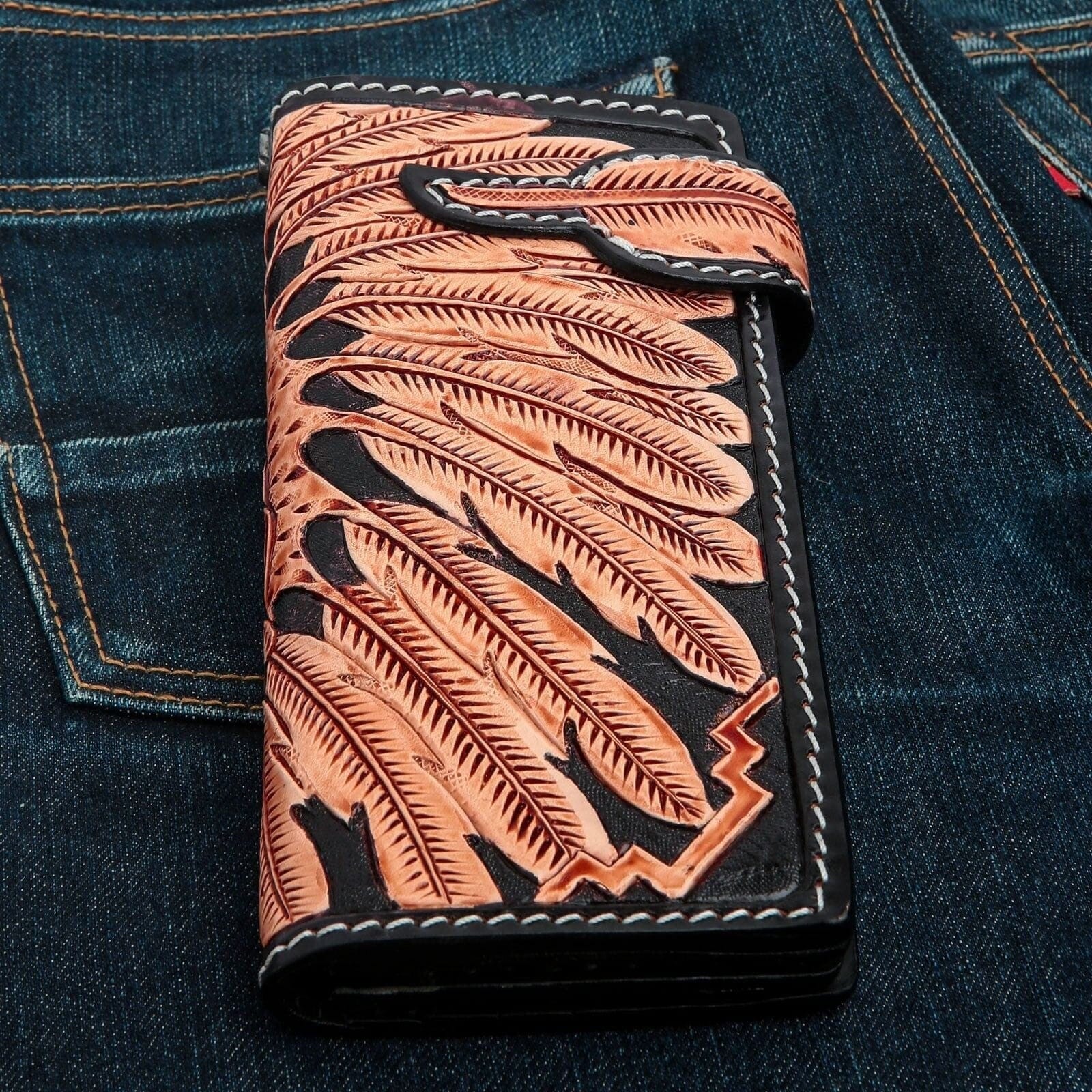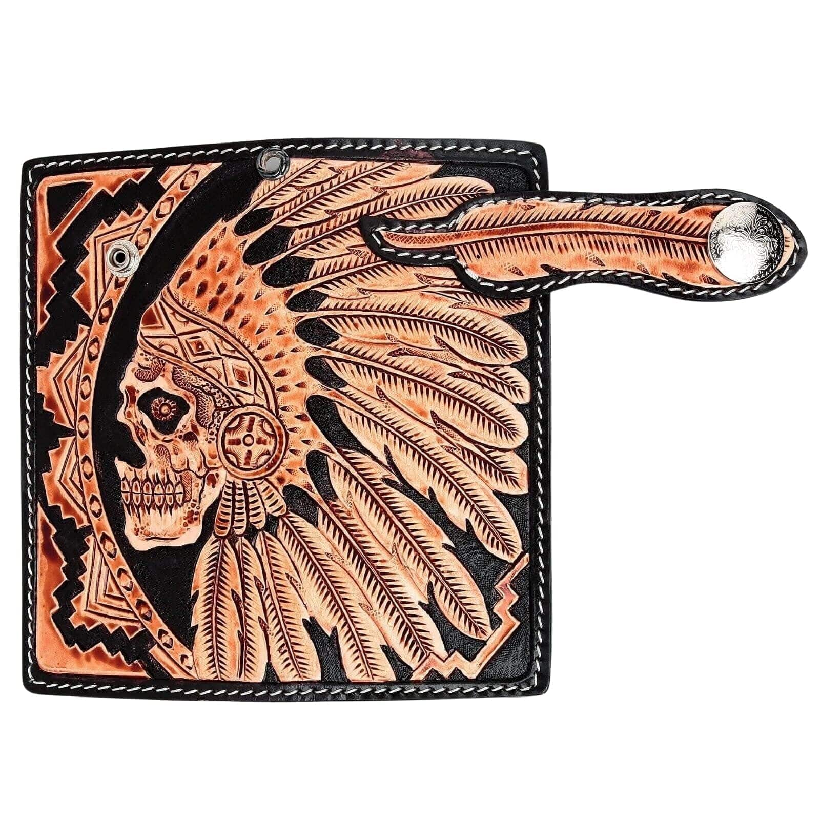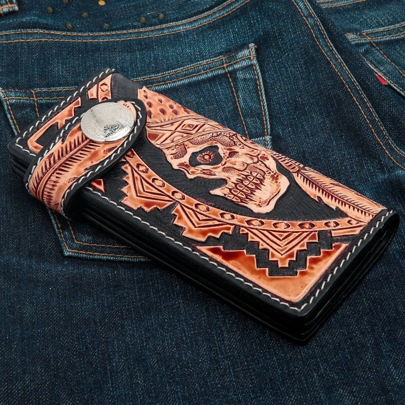 American Indian Skull Biker Wallet | Hand-Carved Genuine Leather Long Wallet