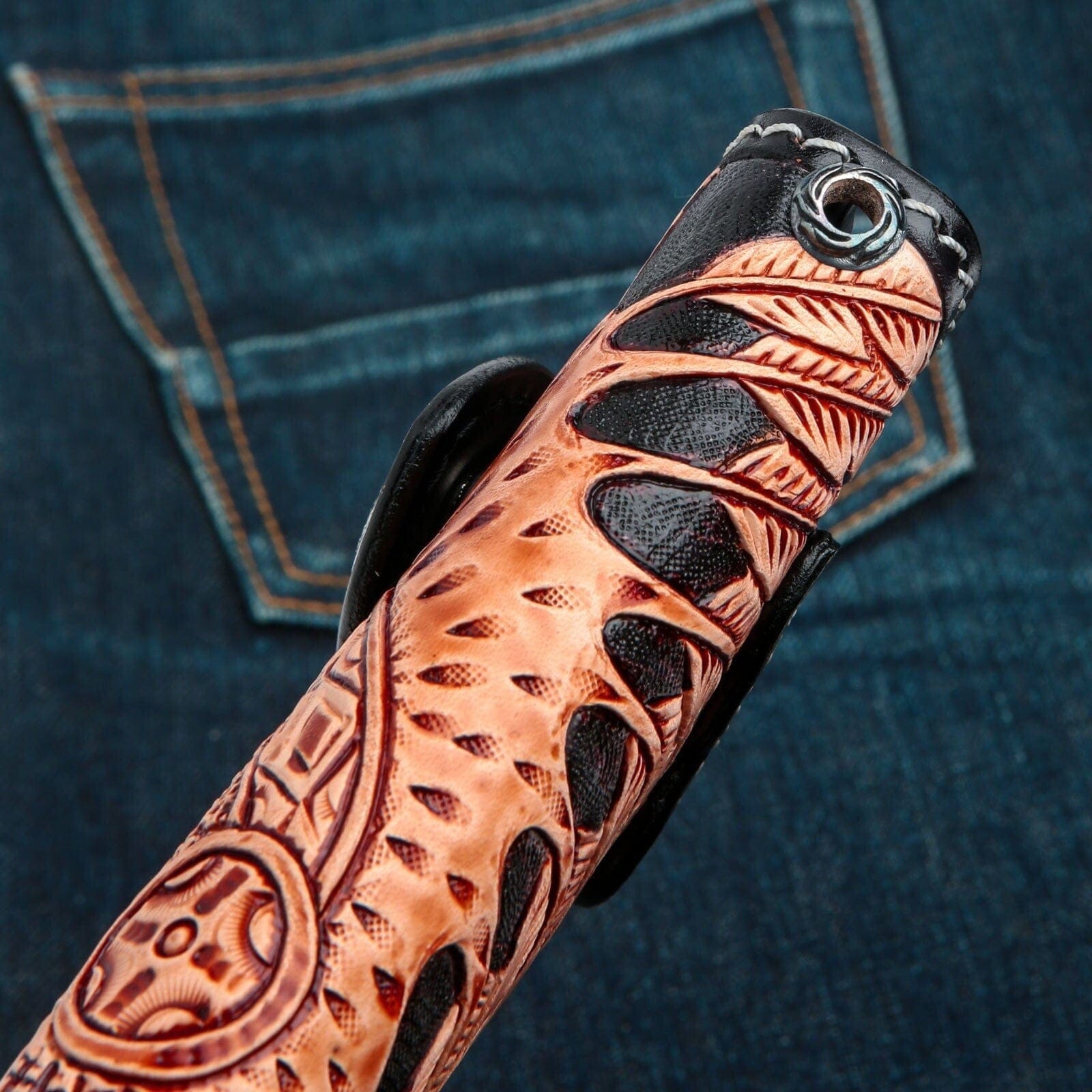 Q: Is the design on the wallet printed or actually carved? A: The design is 100% hand-carved. Our skilled artisans tool the design directly into the leather, which creates the deep, textured effect that makes this wallet a true piece of craftsmanship. You can feel the quality of the work.