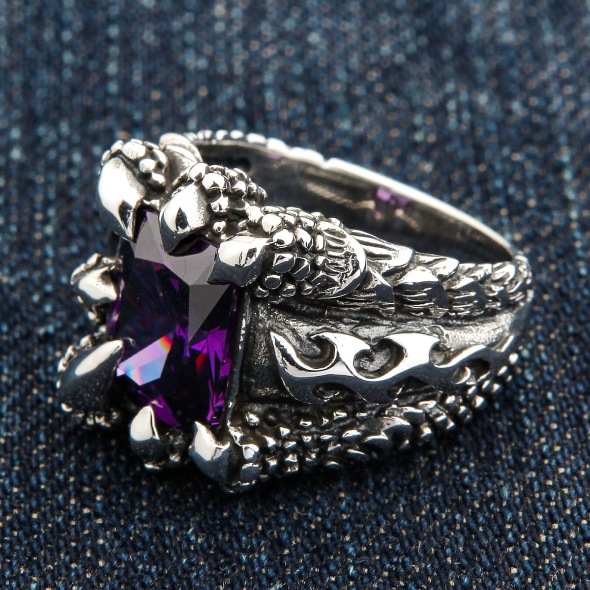 We believe a ring this powerful demands to be forged from real, enduring materials. The entire piece, from the tip of each talon to the solid, bladed band, is crafted from 100% solid .925 sterling silver. This commitment to pure, high-grade silver gives the ring its brilliant shine and the strength to last a lifetime. The centerpiece is a high-quality amethyst-colored Cubic Zirconia, chosen for its flawless clarity and deep, vibrant purple hue that perfectly contrasts with the cool silver.