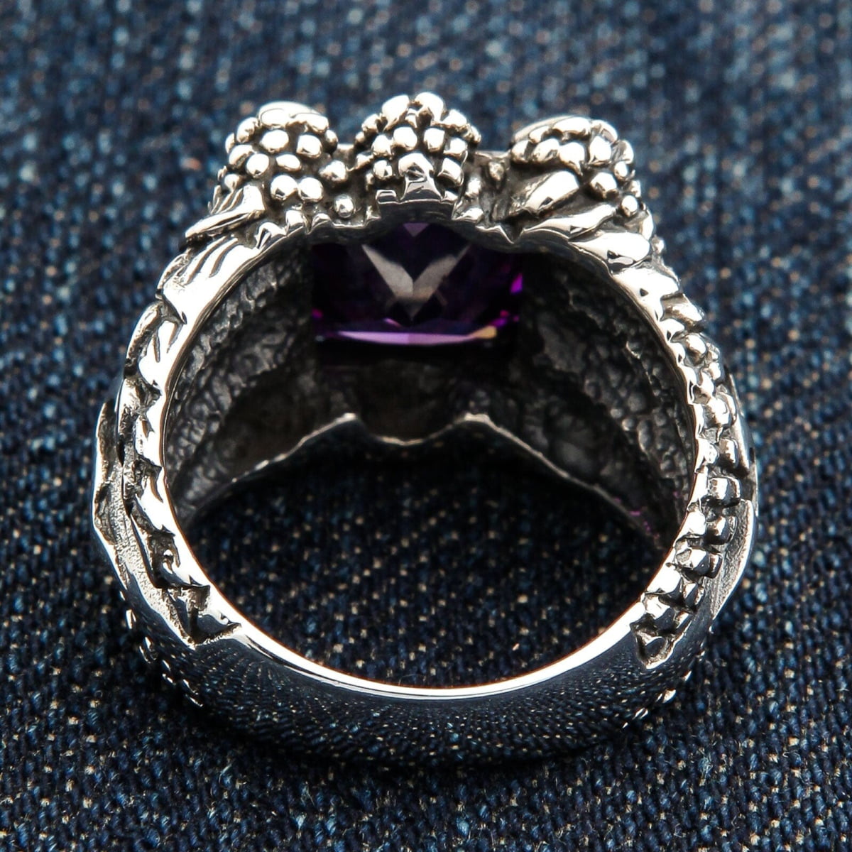 This ring is a tribute to the undisputed king of the skies. The entire band is a masterfully sculpted eagle's claw, covered in a rough, scaly texture that is brought to life with a dark, oxidized finish. From this powerful base, four sharp, polished talons rise up to form a possessive setting, fiercely clutching their royal prize. At its heart lies a magnificent, large princess-cut purple amethyst stone, its deep, regal hue a symbol of wisdom, royalty, and spiritual power. Weighing a substantial 17 grams, this solid silver masterpiece has the powerful, premium feel of a true artifact, fit for a king.
