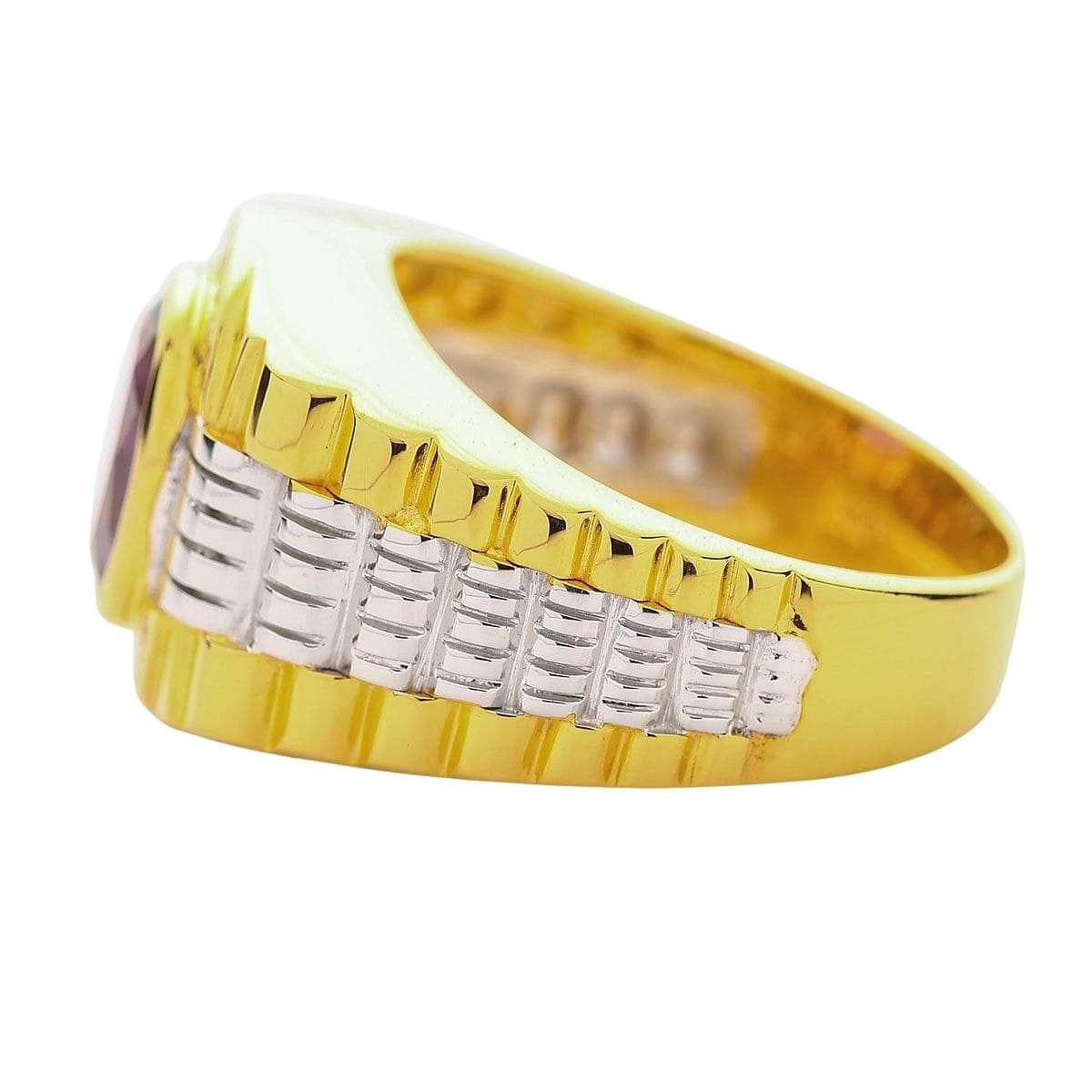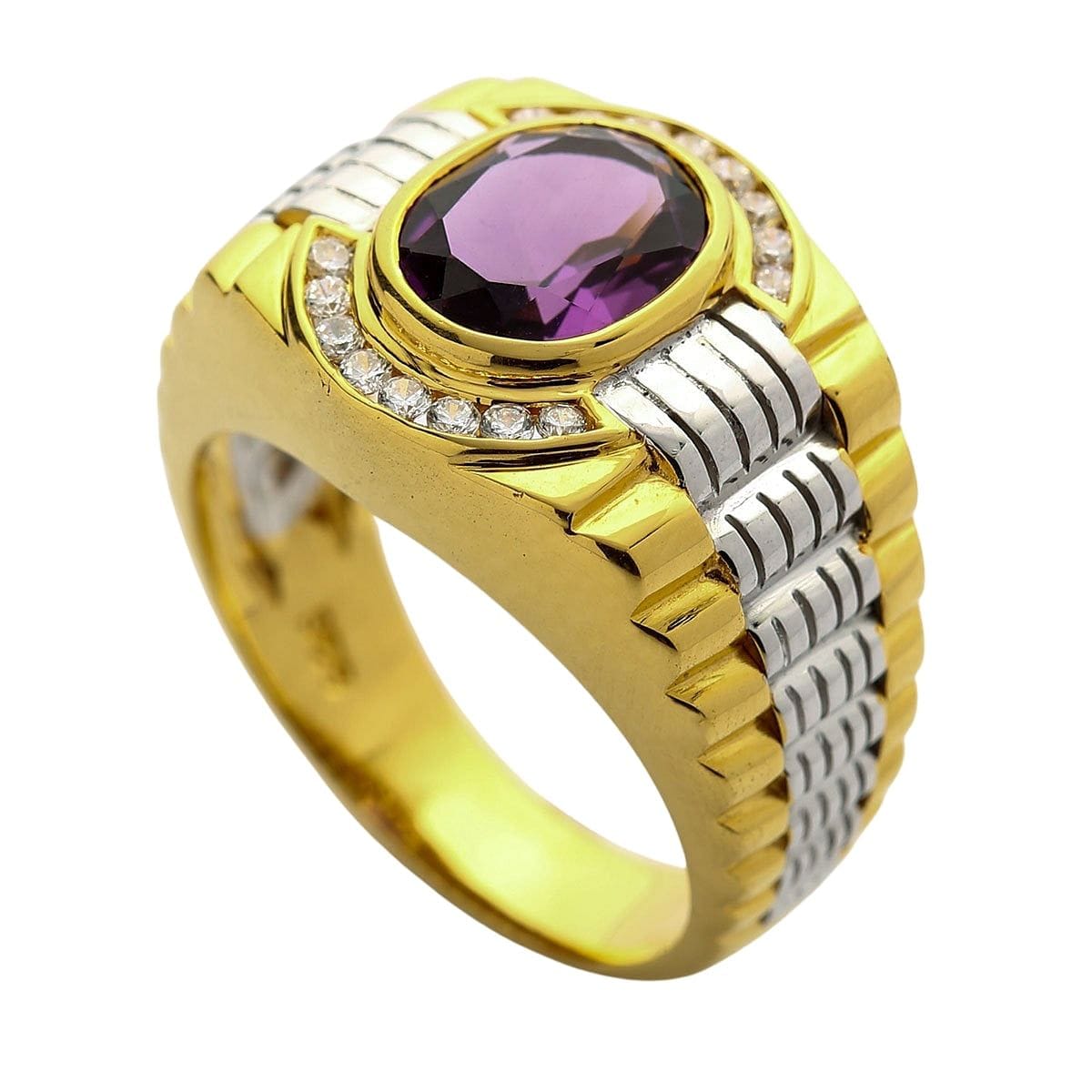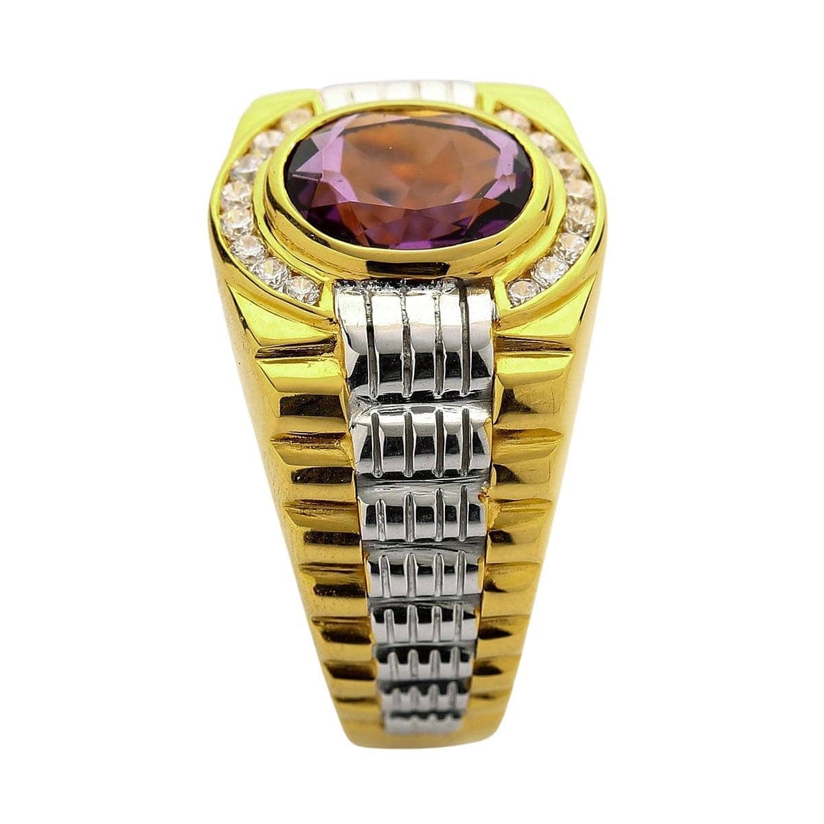 The design is inspired by the iconic Rolex-style watch band. The band features distinctive two-tone "links"—a polished gold-plated base accented by solid 925 silver "center links." This watch strap motif is instantly recognizable and adds a unique, horological-inspired feel. The large, 9x11mm natural amethyst is held securely and flanked by a halo of 16 sparkling clear CZ stones, giving the ring an undeniable brilliance. It's a heavy, 11-gram piece that feels as substantial as it looks.