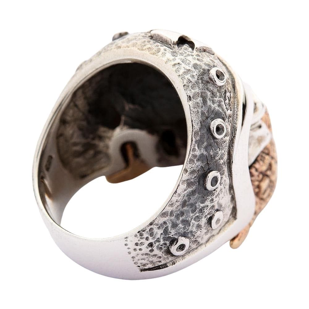 Q: Is the bandana part of the ring really made of copper? A: Yes, the bandana on this rider skull ring with bandana is made from genuine copper, which is carefully inlaid and crafted onto the sterling silver base. This creates a beautiful, warm contrast and a unique, custom two-tone look that sets it apart from other skull rings.
