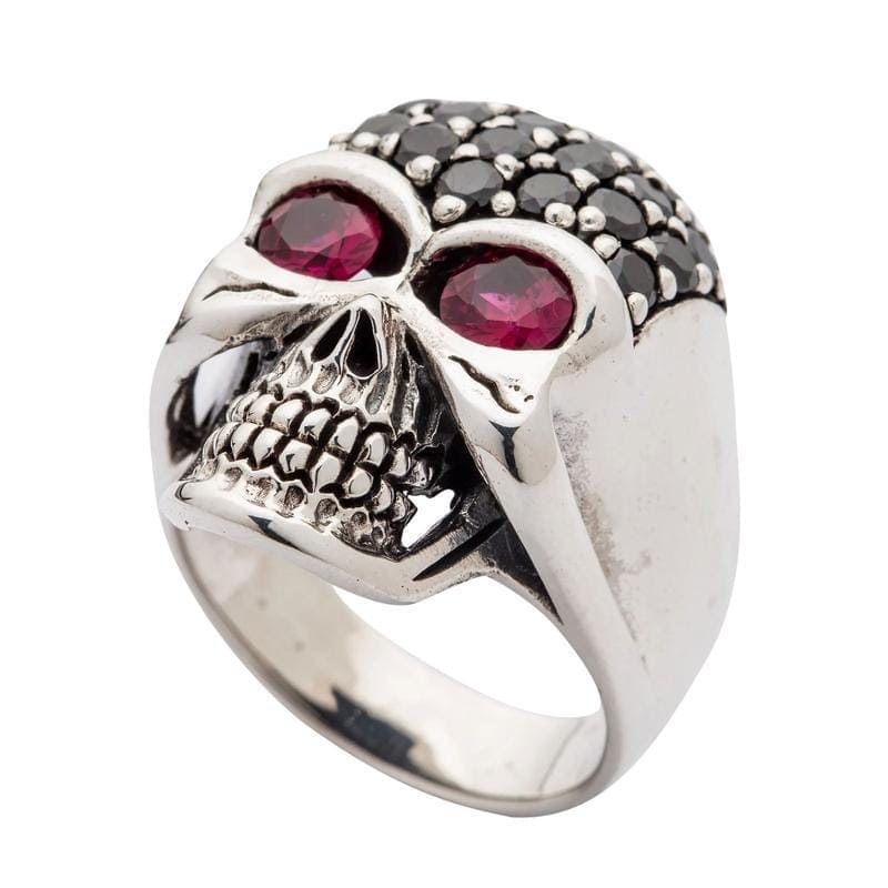 Define your own brand of beauty and embrace your power with this exquisite lady skull ring. This is where dark elegance meets unapologetic strength. Forged from solid .925 sterling silver and set ablaze with glittering black and deep red stones, this ring is a bold statement of fierce femininity. It’s the perfect piece for the woman who is both a queen and a rebel, a true icon of modern gothic glamour.