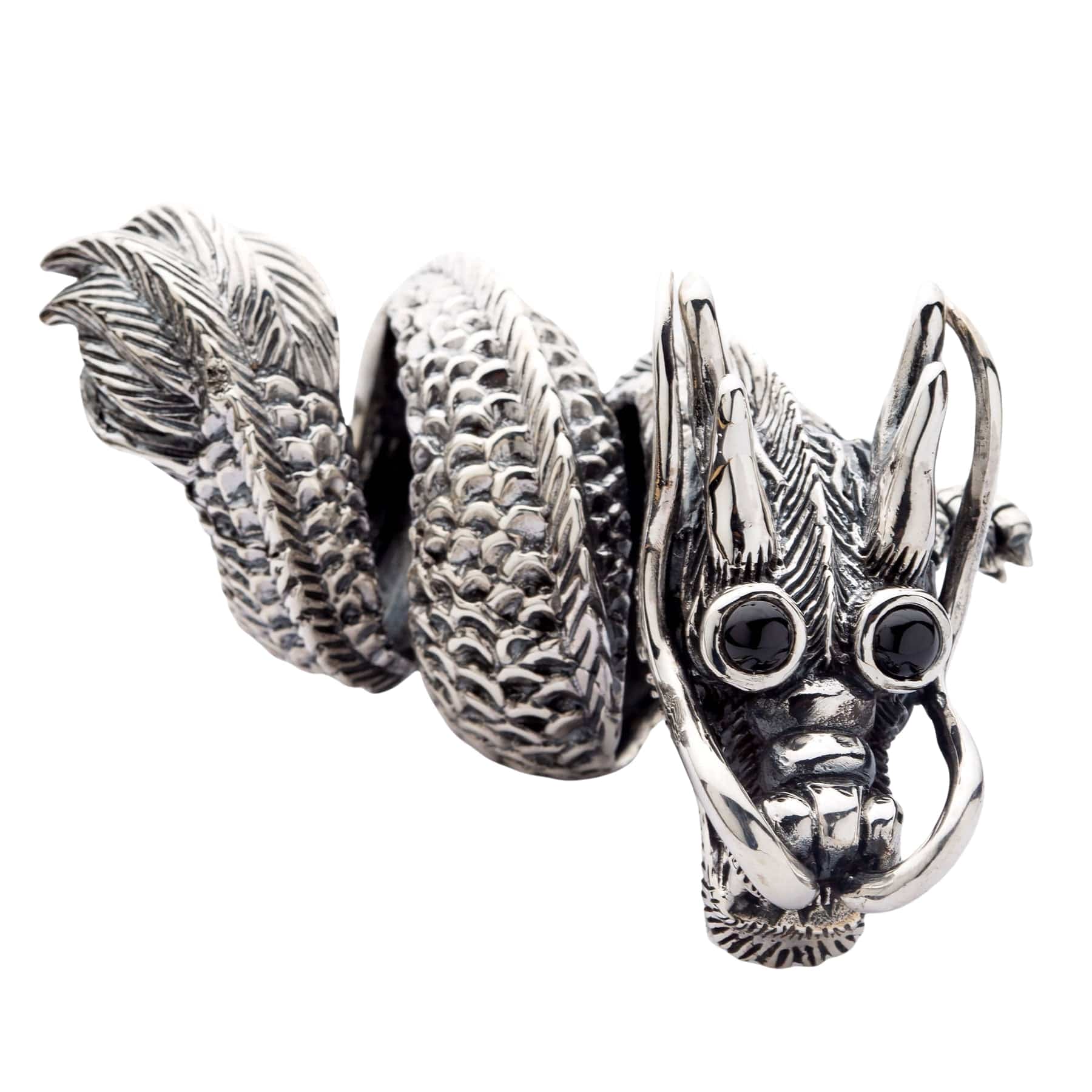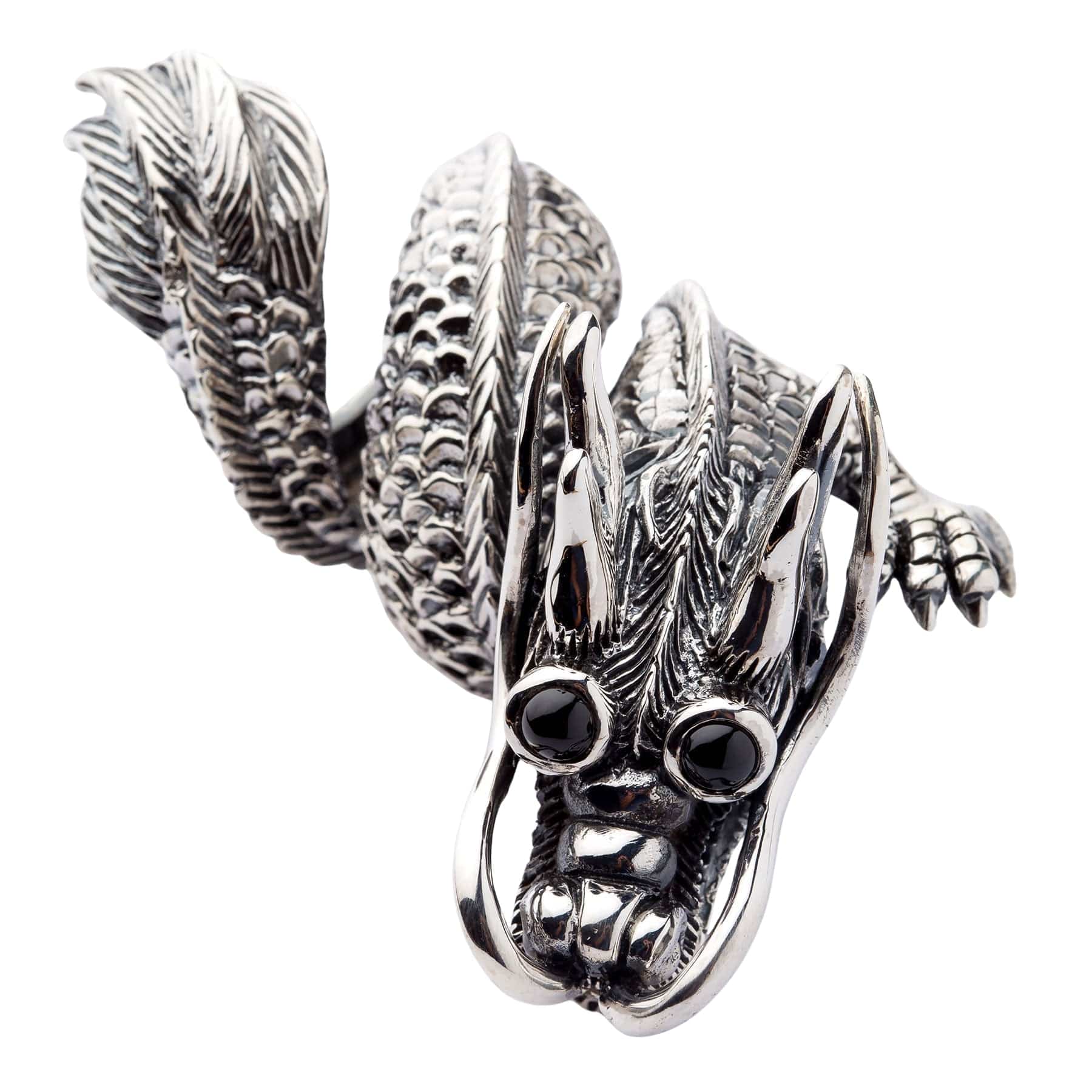 Seventy-eight grams. This is the heaviest ring in the entire dragon collection — and one of the heaviest in the store. The Massive Black Eye Dragon Ring is a full Eastern dragon sculpted in .925 sterling silver, with the dragon's face measuring 50mm wide × 75mm tall (roughly 2" × 3"). Two black CZ stones sit recessed as the dragon's eyes, dark and flush with the skull. This ring doesn't suggest a dragon on your finger — it puts an actual dragon-sized sculpture on your hand.