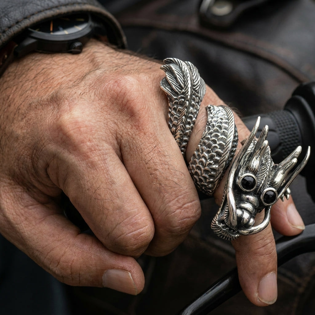 If you want the biggest dragon ring available — at 78 grams with a 50mm × 75mm face, this dwarfs everything else in the collection. The Knight Dragon (23g, 32×35mm) is bold. The Massive Dragon Head (37g, 20×25mm) is heavy. This is three times the weight of both and nearly 3 inches tall. There's nothing subtle about it.