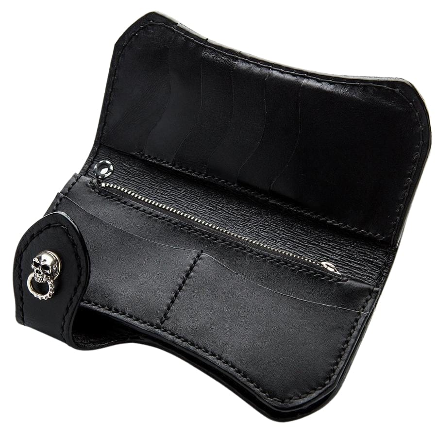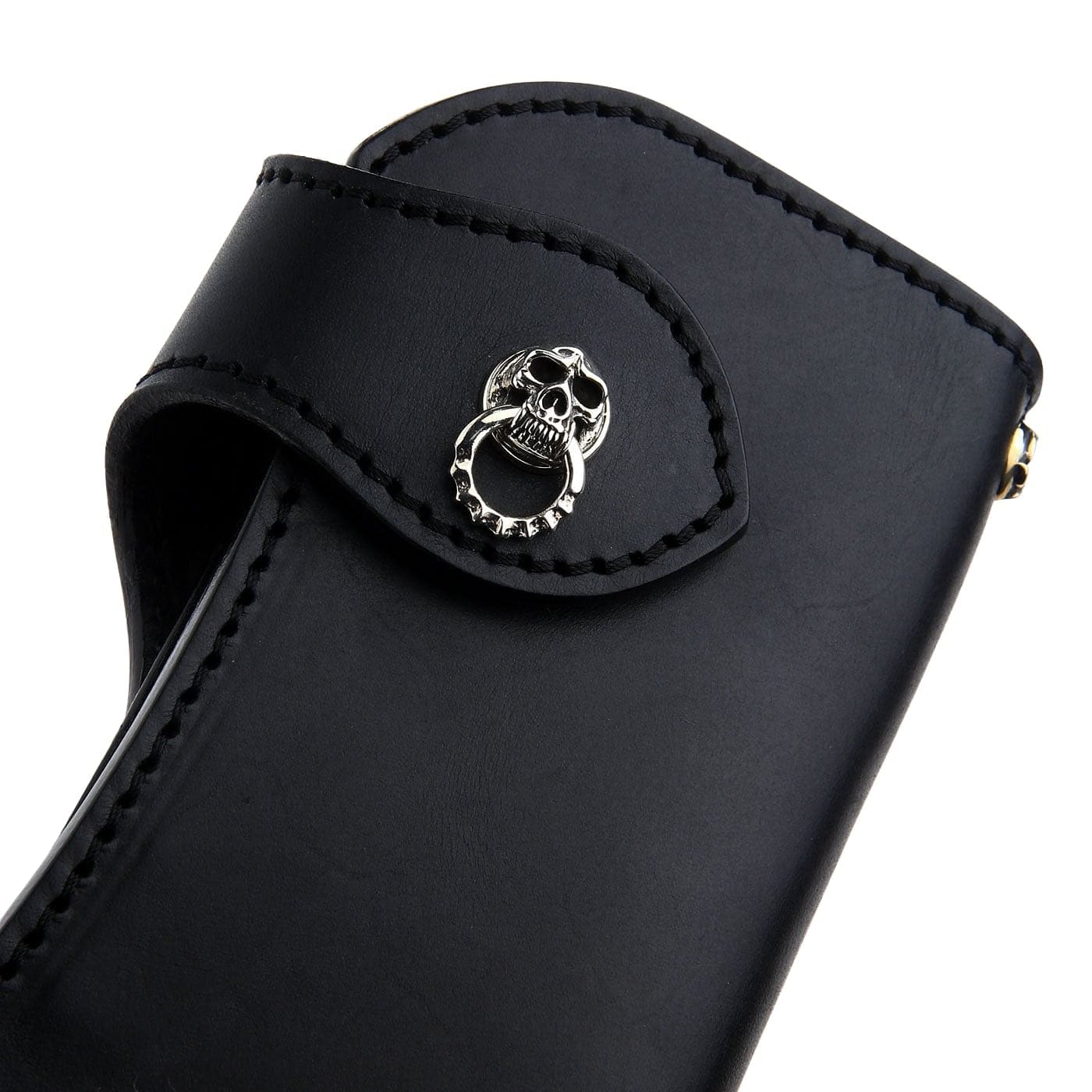 Handcrafted Black Leather Biker Wallet with Silver Skull Snap