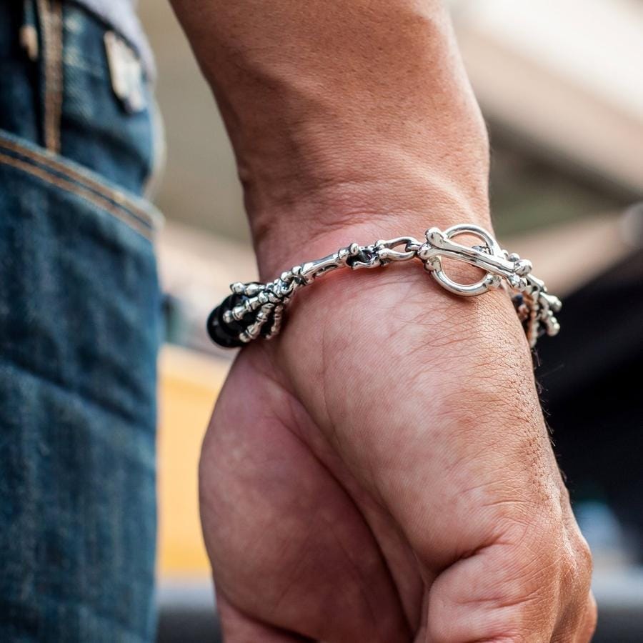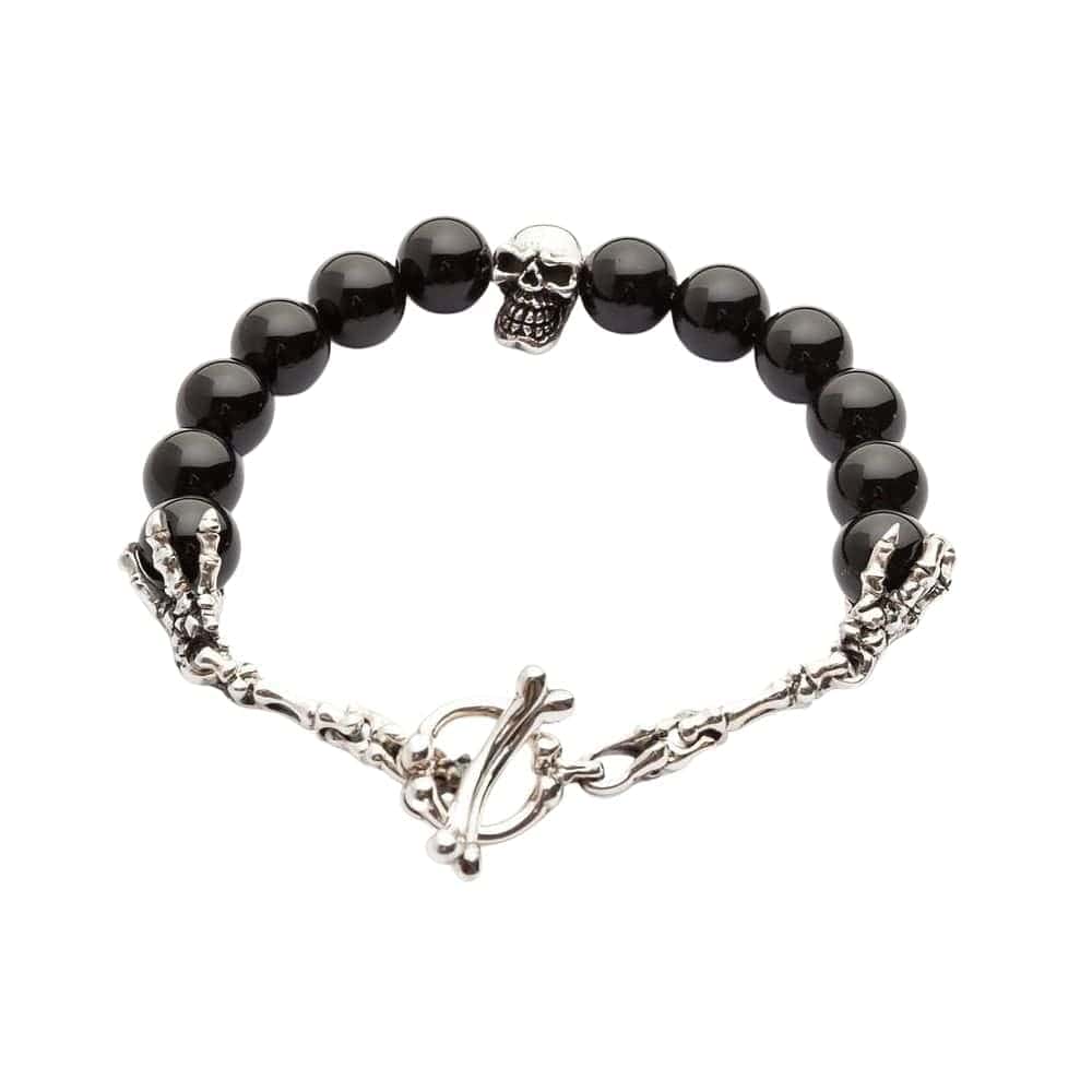 Q: How do I style a men's black bead skull bracelet? A: This skeleton hand bracelet is a versatile statement piece. It pairs perfectly with leather jackets, denim, and band tees for a complete rocker or biker look. It can also be stacked with other silver chains or leather cuffs or worn on its own as a bold centerpiece.