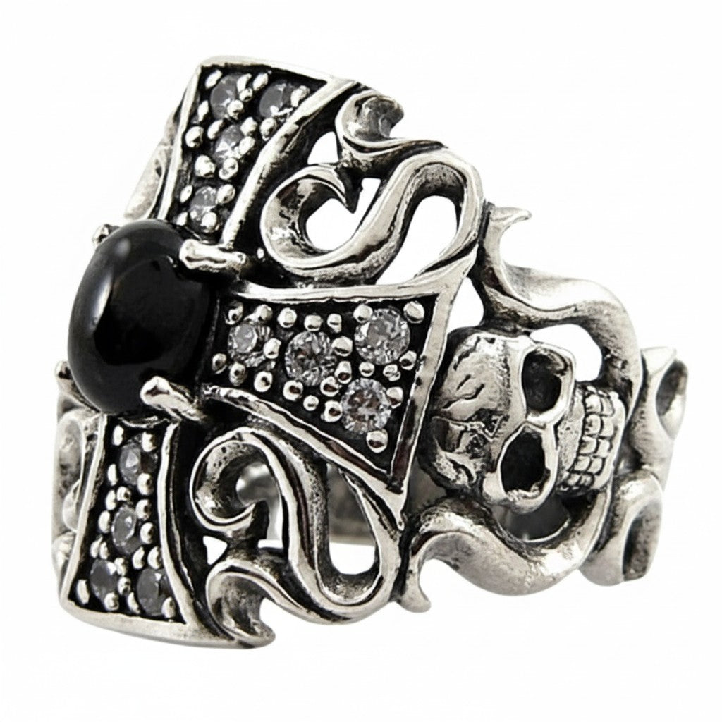 This ring is a multi-layered marvel of design and meaning. The face is dominated by an ornate gothic cross, its arms a tapestry of swirling filigree and brilliant, pave-set clear stones that sparkle with every movement. At the very heart of the cross rests a deep, mysterious black star gemstone. This unique cabochon is known to reveal a hidden cross of light, symbolizing a guiding star in the darkness—a perfect metaphor for faith. But the story doesn't end there. Tucked away within the scrollwork on the side is a grim skull, a powerful reminder of our shared mortality. This fusion of the sacred, the macabre, and the mystical, rendered in a massive 20 grams of solid silver, creates a truly unforgettable statement piece.