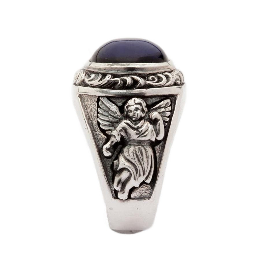 At the heart of this exquisite piece lies a captivating 14mm x 14mm Cabochon blue Cubic Zirconia. This deep blue centerpiece evokes the calmness of the ocean and the depth of the sky, polished to perfection to radiate sophistication. Flanking this stunning gem are intricate carvings of Cupid—or Eros as known in Greek mythology—the winged deity whose arrows spark uncontrollable desire. Unlike typical designs, our handcrafted approach ensures that every feather on the angel's wings and every curve of the silhouette is defined with precision.
