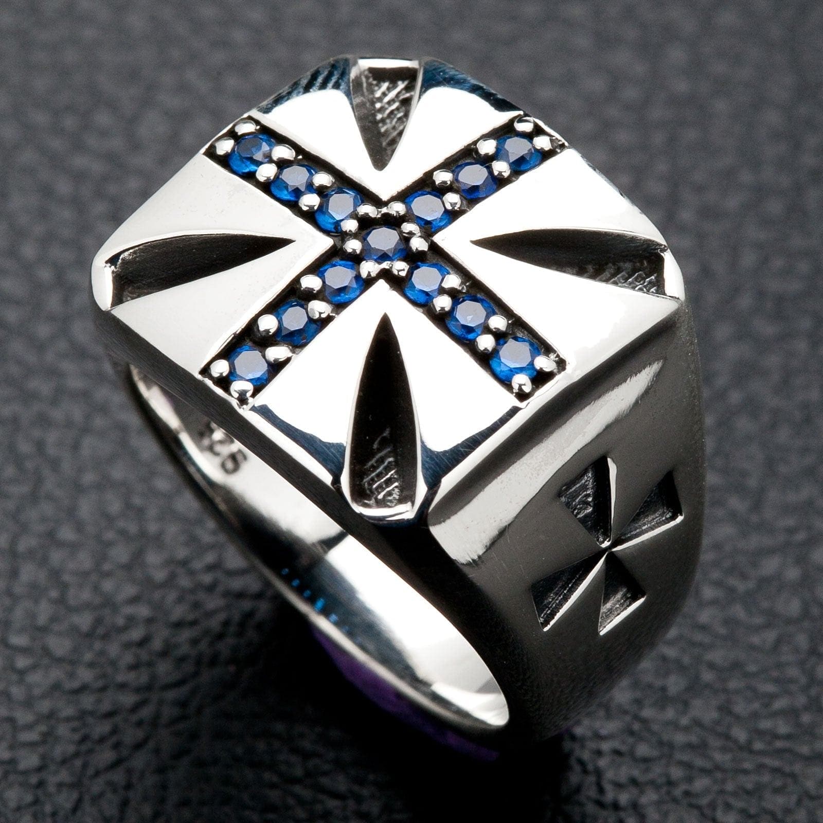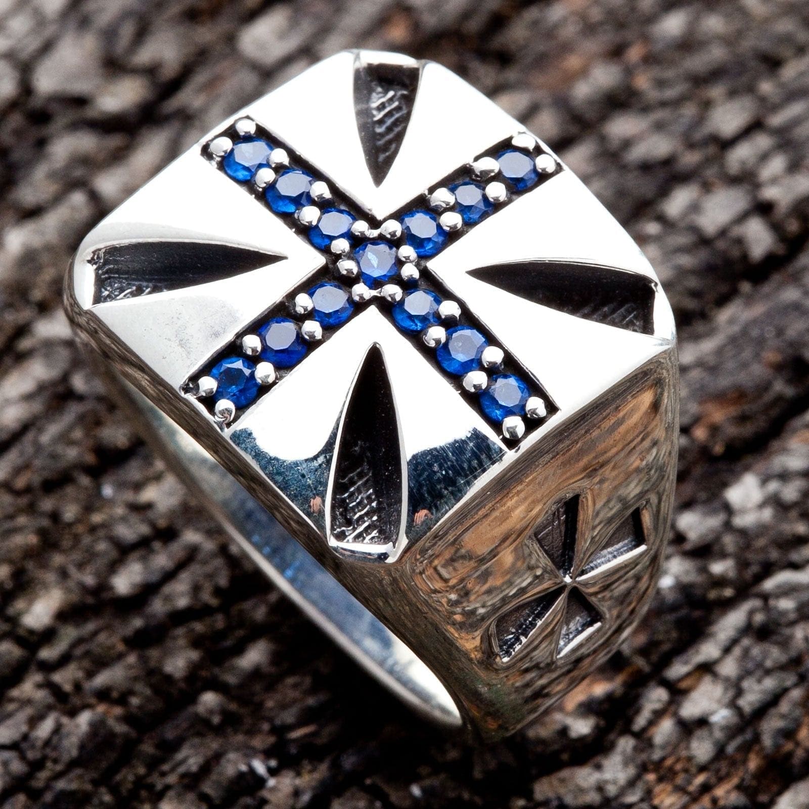 Maltese Cross Ring – Sterling Silver Blue Stone Biker Jewelry